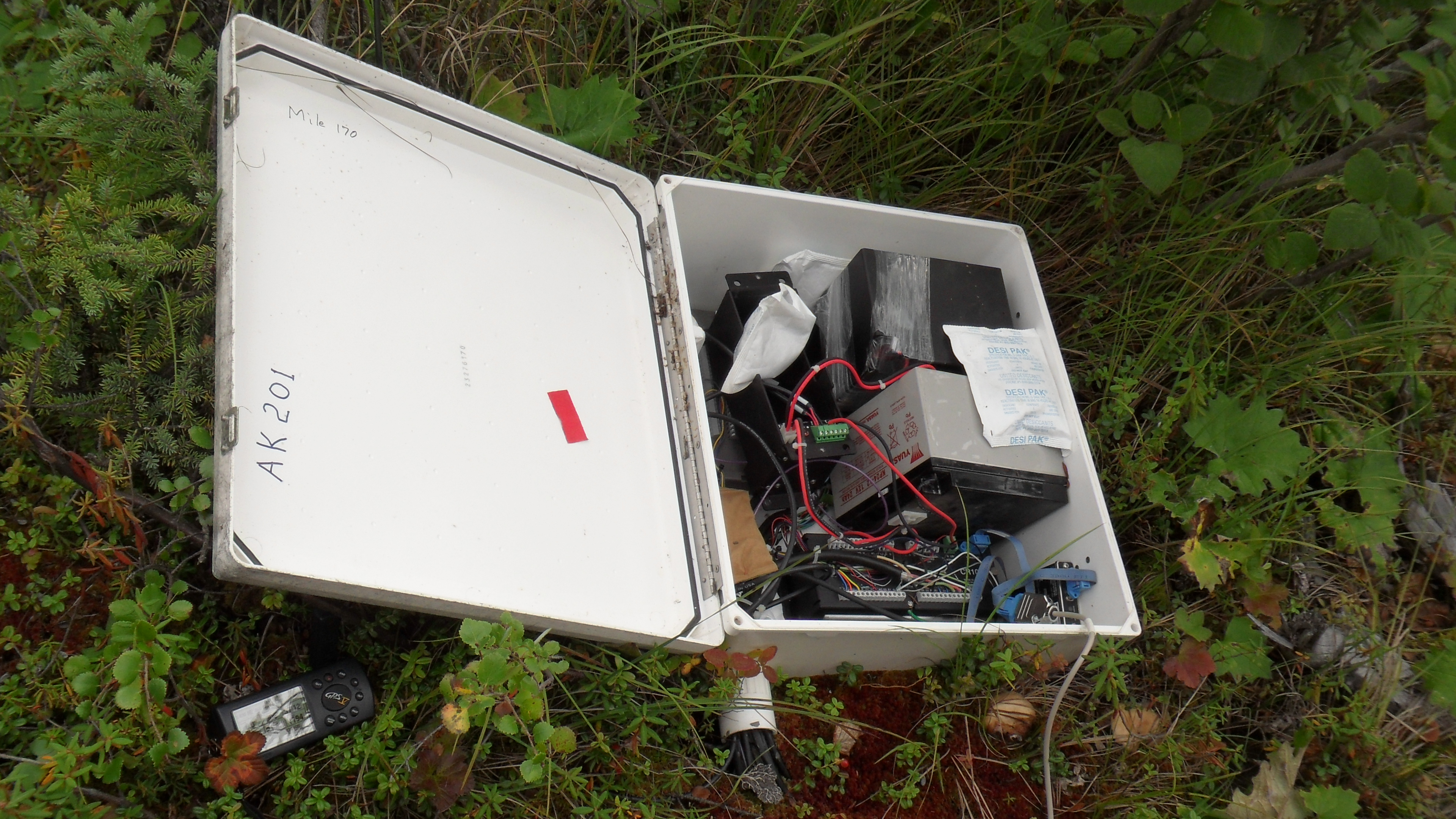 All of the hardware required for data logging at the soil monitoring stations are kept in weather-proof boxes like this one. Dalton Highway, Alaska.