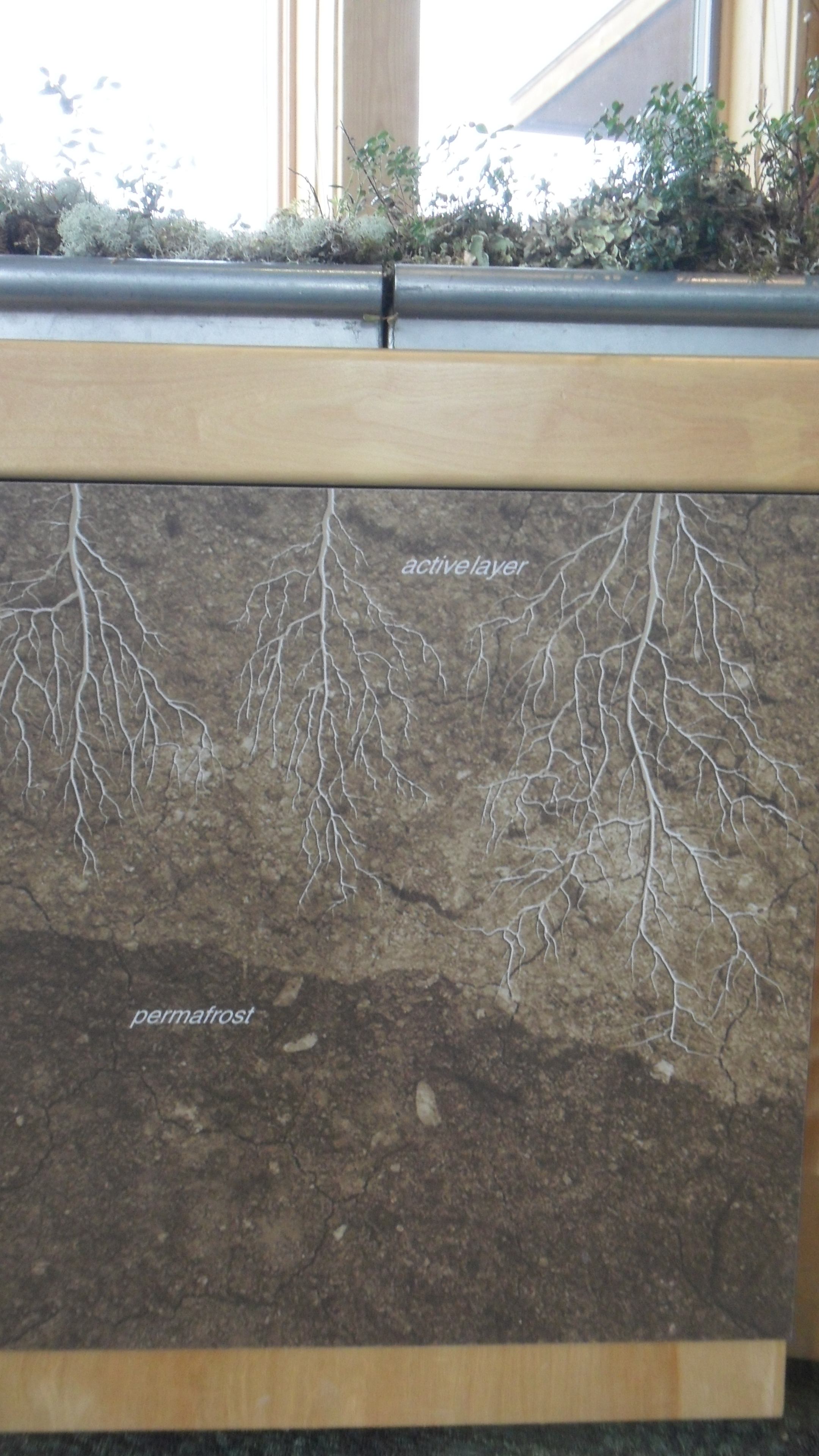 The Arctic Interagency Visitor Center in Coldfoot has an educational exhibit explaining the relationship between vegetation and permafrost in the area. In this photo, plant roots extend into the active, or seasonally thawed, layer of soil. No roots extend into the permafrost. Coldfoot, Alaska.