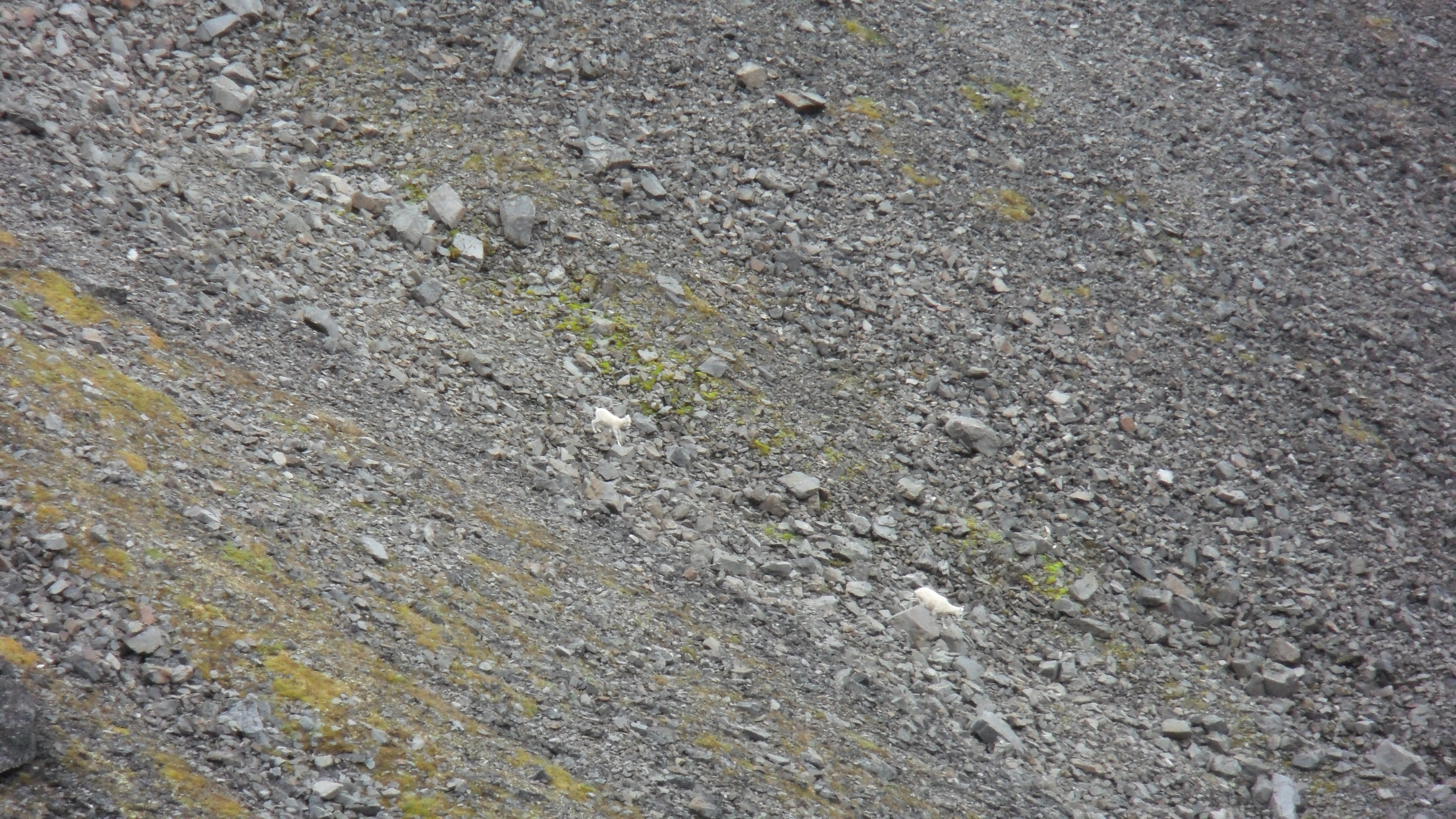 Two Dall sheep on a rocky slope near Atigun Pass. Dalton Highway, Alaska.