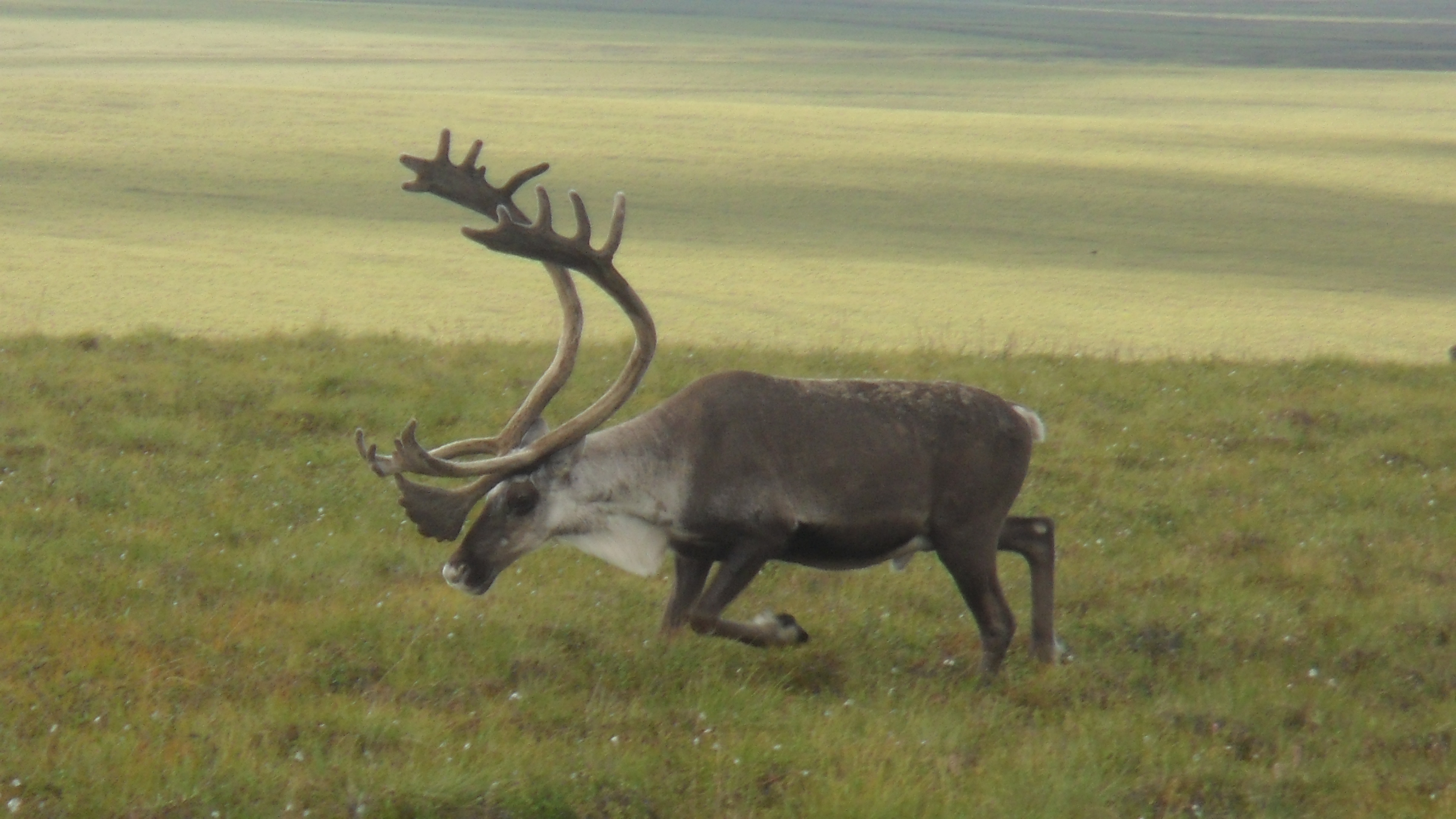 A male caribou casually walks near one of the team's data collection sites. Toolik Field Station, Alaska.