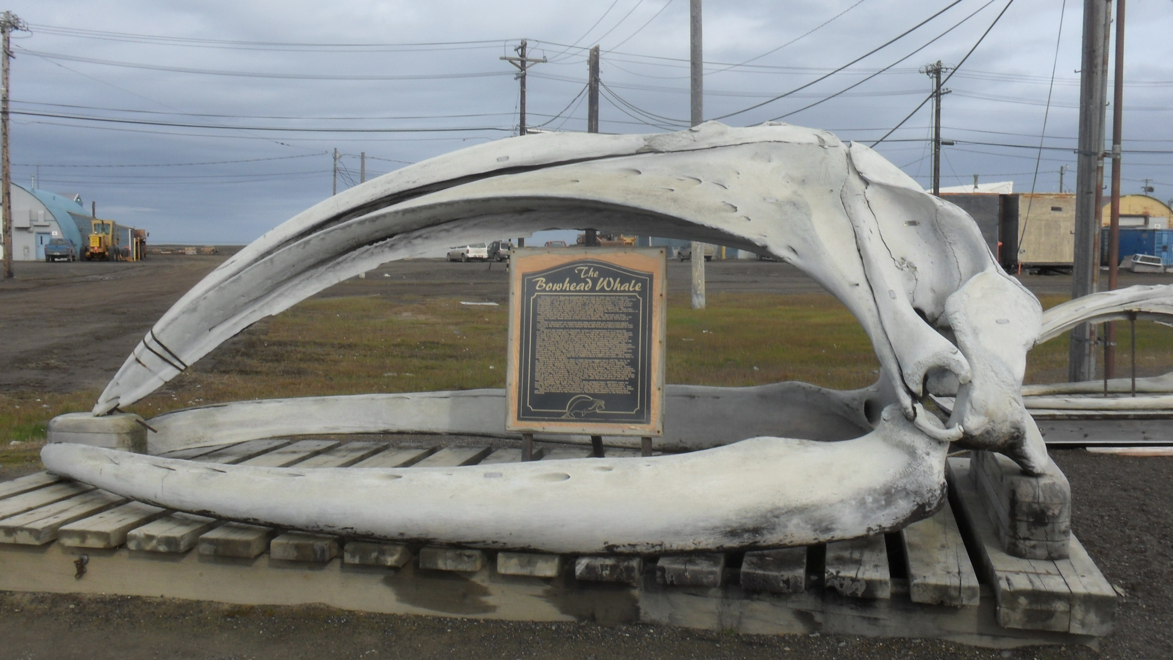 The skull of a bowhead whale sits outside the the BASC (Barrow Arctic Science Consortium) headquarters. Barrow, Alaska.