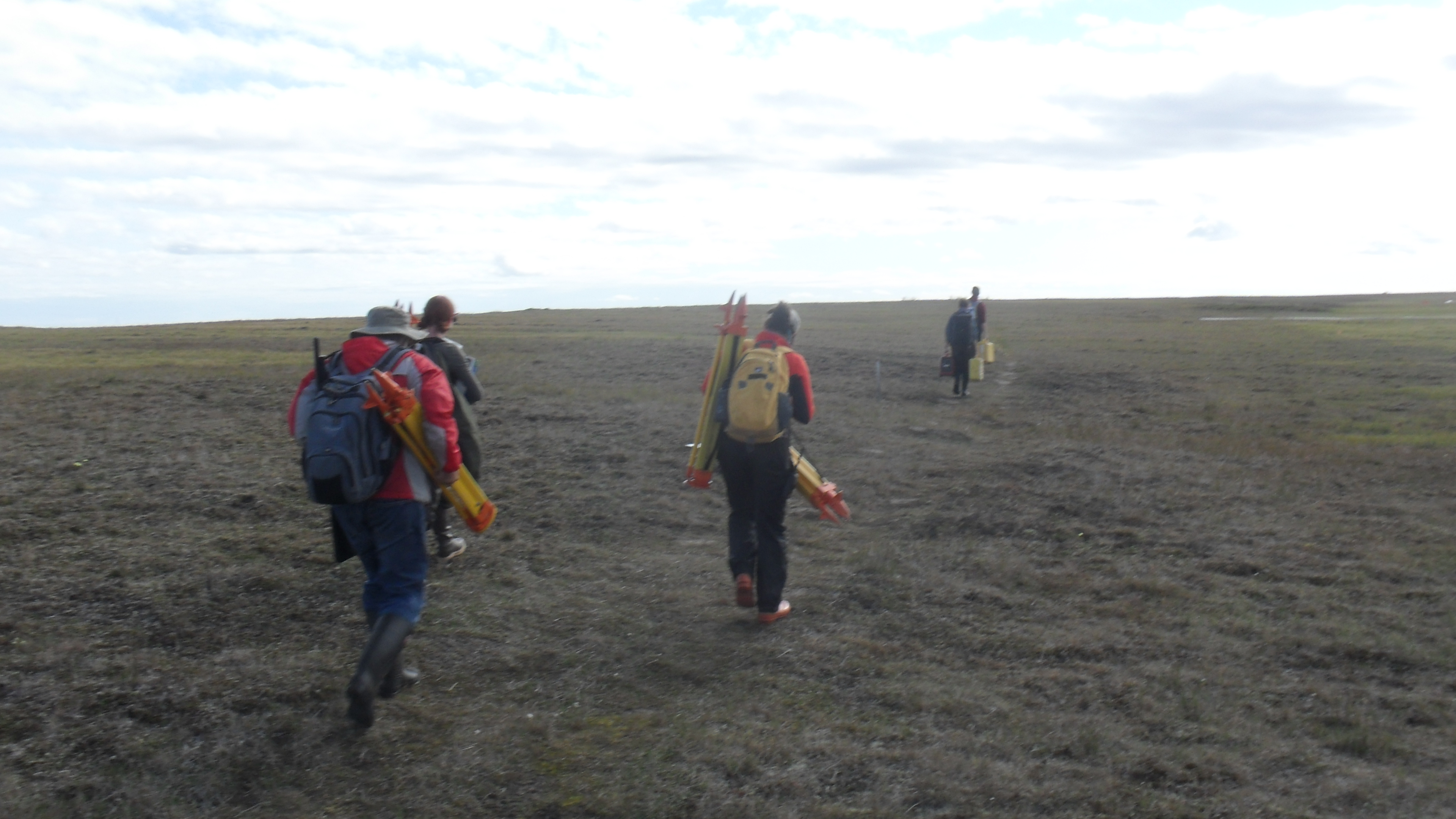 The crew carries LIDAR (Light Detection and Ranging) equipment to a field site. 400 lbs of gear are required to make the LIDAR operate. Barrow, Alaska.