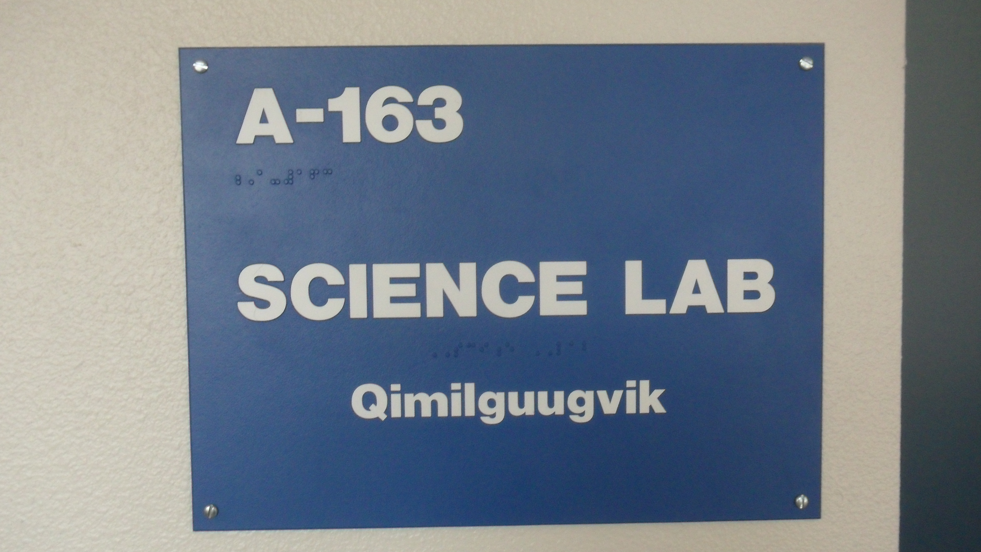All of the name plates for the classrooms at Barrow High School include Inupiat translations. Barrow, Alaska.