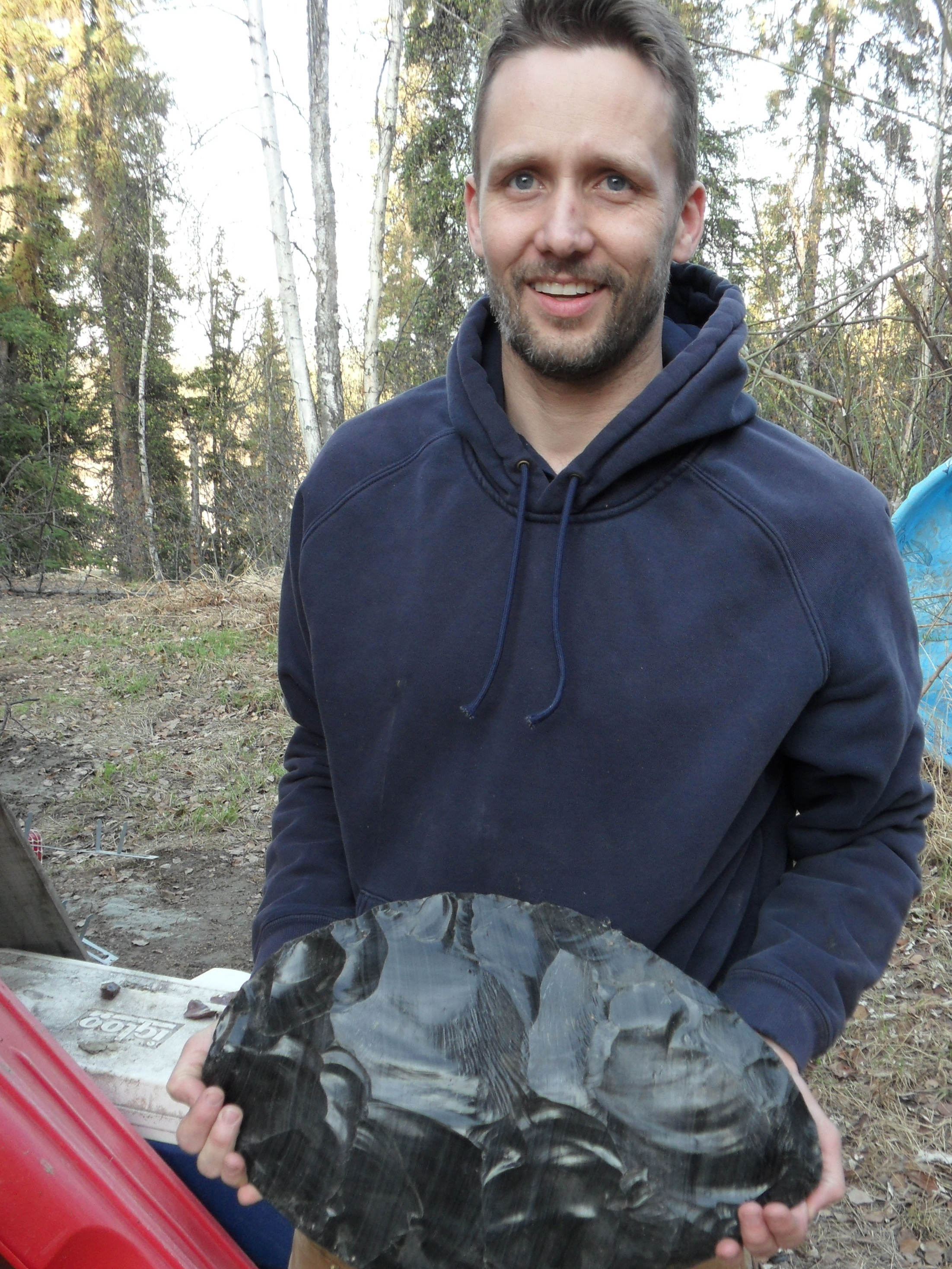 Karl Horeis: "Dr. Jeff Rasic made this giant obsidian stone tool with a colleague a few years ago. The obsidian comes from Oregon. Making tools this way is called "flint knapping." Rasic enjoys flint knapping because it helps him understand how the artifacts he finds were made. We don't expect to find anything this large in the Arctic this summer." In Dr. Jeff Rasic's backyard near Fairbanks, Alaska.