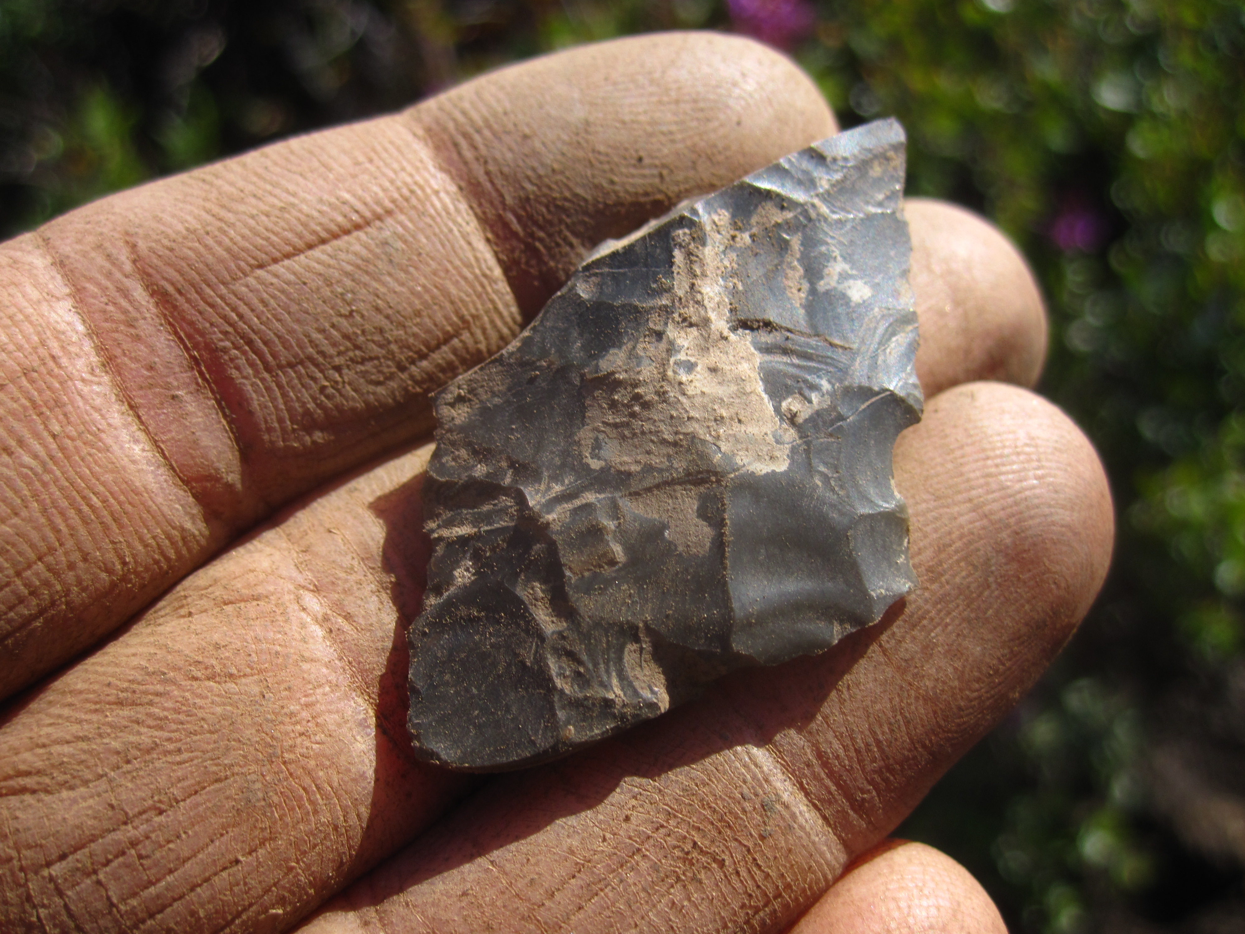 A fluted point found at the excavation site. The grooves that come up the face of the tool from the bottom are the flutes. Raven Bluff, Alaska.