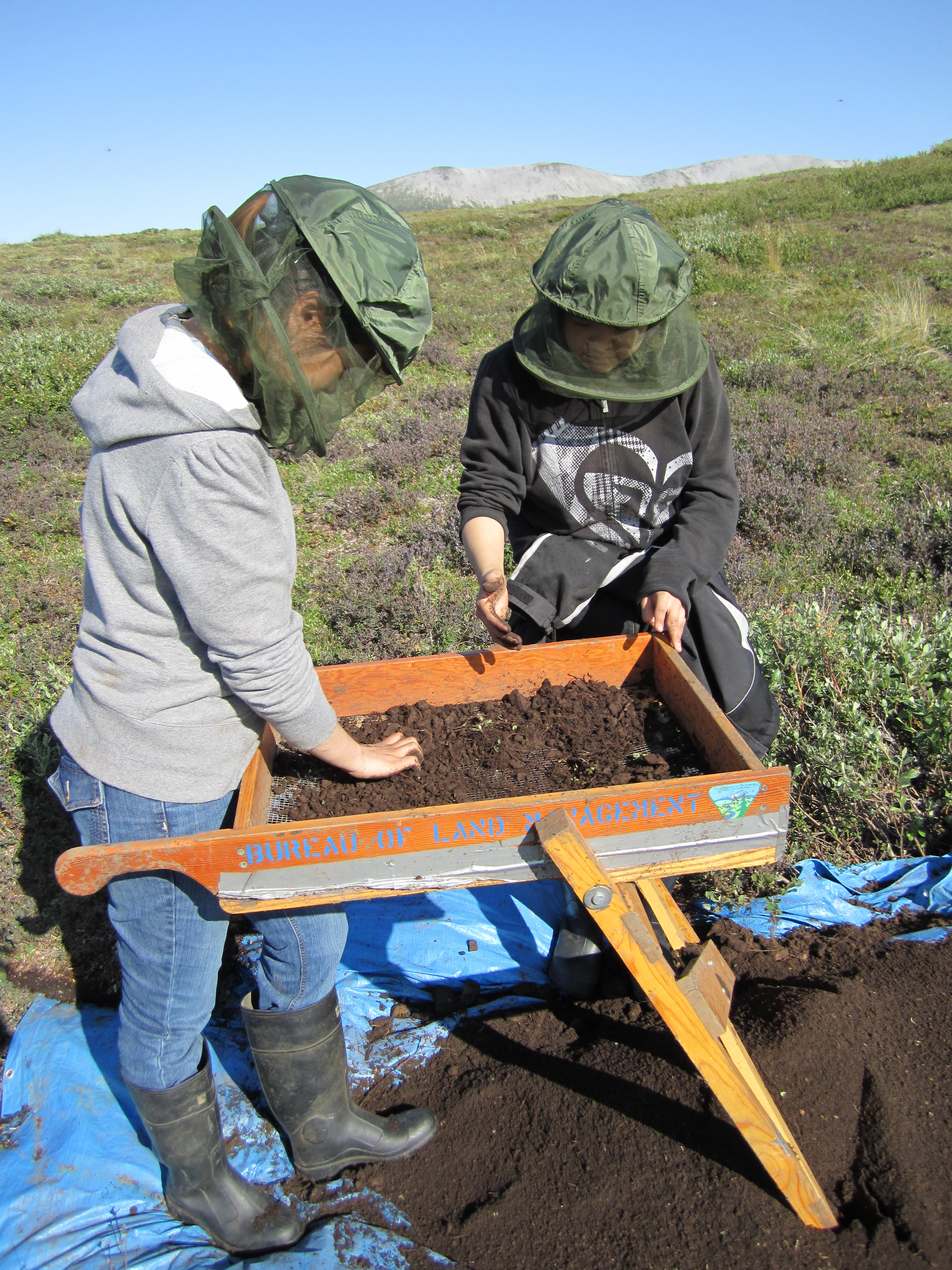 Karl Horeis: "The girls were very careful about screening through the soil in the screen. It was here that they found the tiny green flakes of chert left by ancient tool makers." Raven Bluff, Alaska.