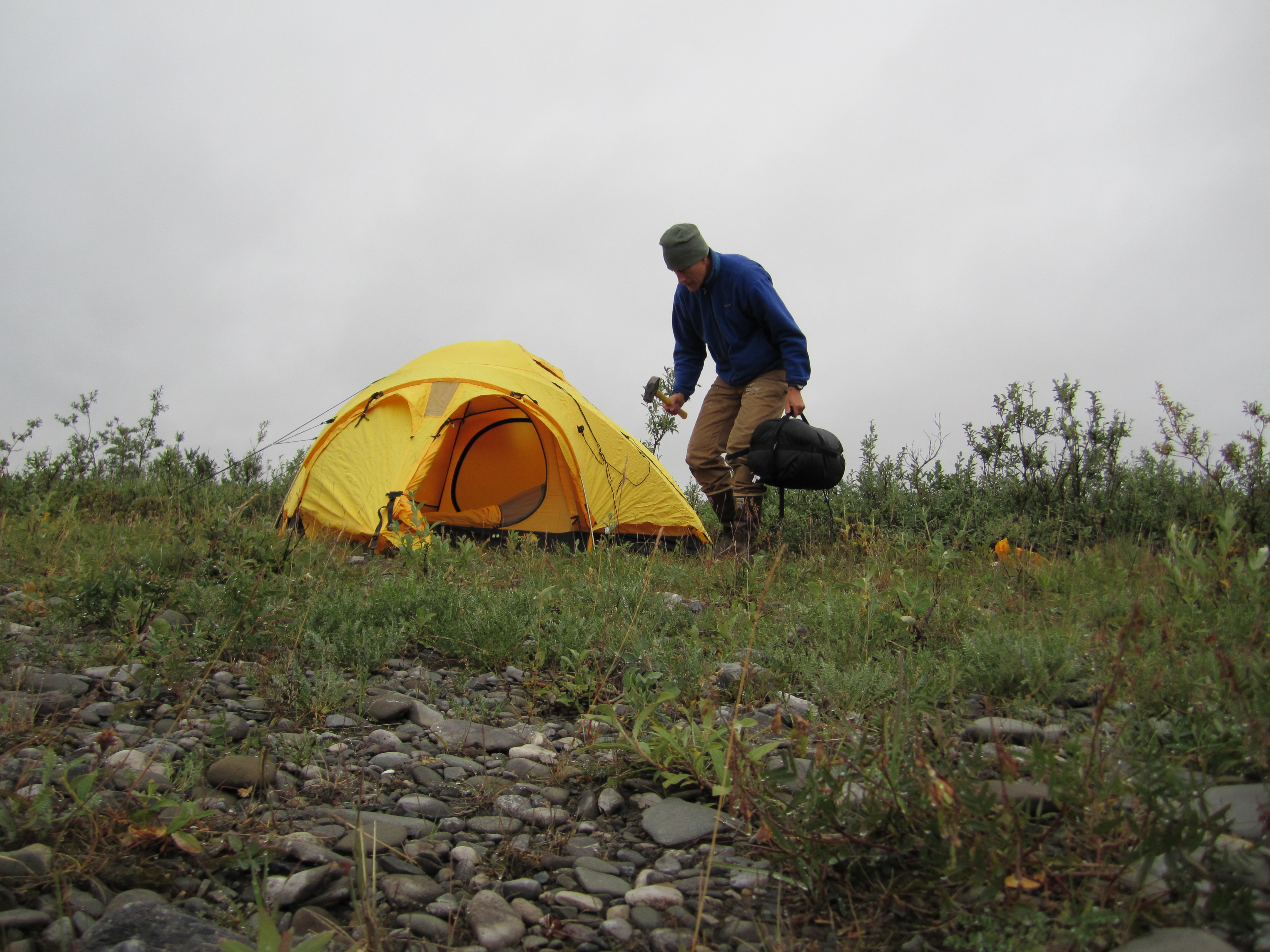 Karl Horeis: "Here is the Northface four season tent we set up for the students. This is a really rugged tent that wouldn't be out of place in a base camp on Mt. Everest. Hopefully it will keep them warm. The researchers just came back from the excavation shaking with cold. They say it's very close to snowing up there!" Raven Bluff, Alaska.