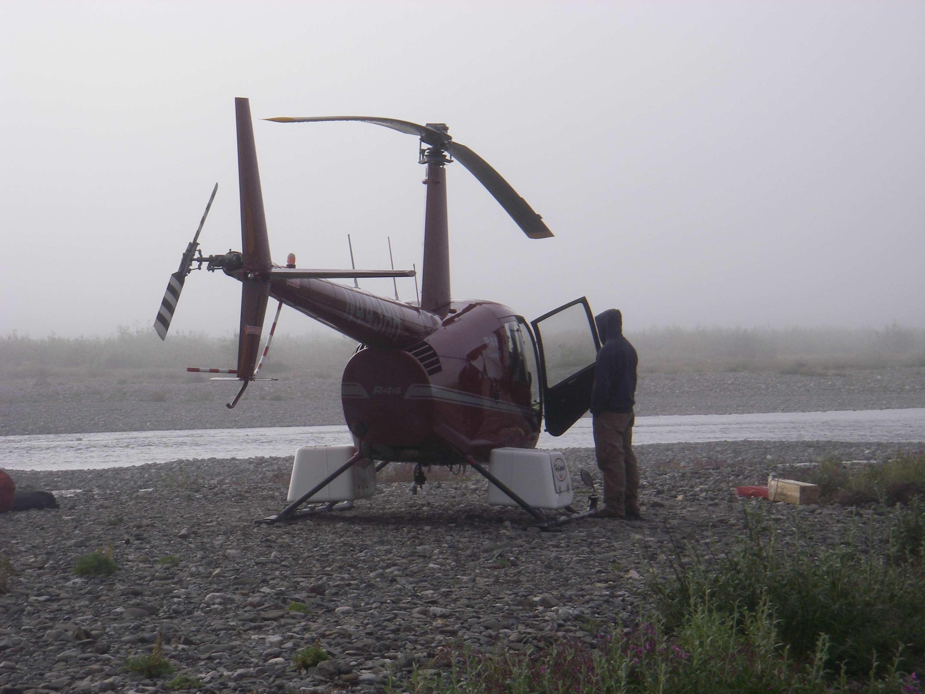 Grounded due to limited visibility, the helicopter sits waiting for the sun to come out. Raven Bluff, Alaska.