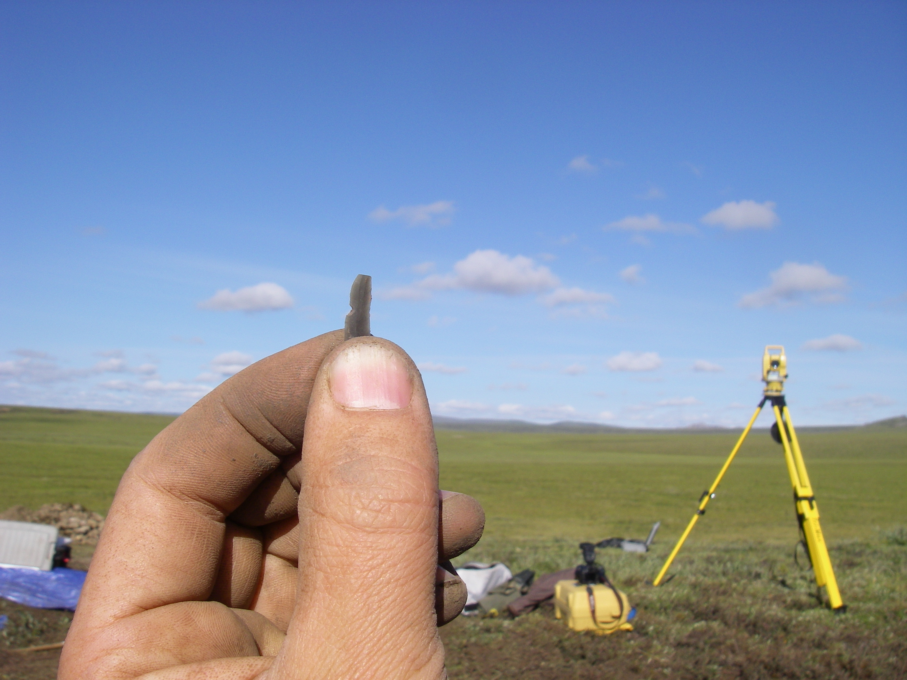 This is an example of a microblade -- a tiny flint knapped stone tool. Raven Bluff, Alaska.