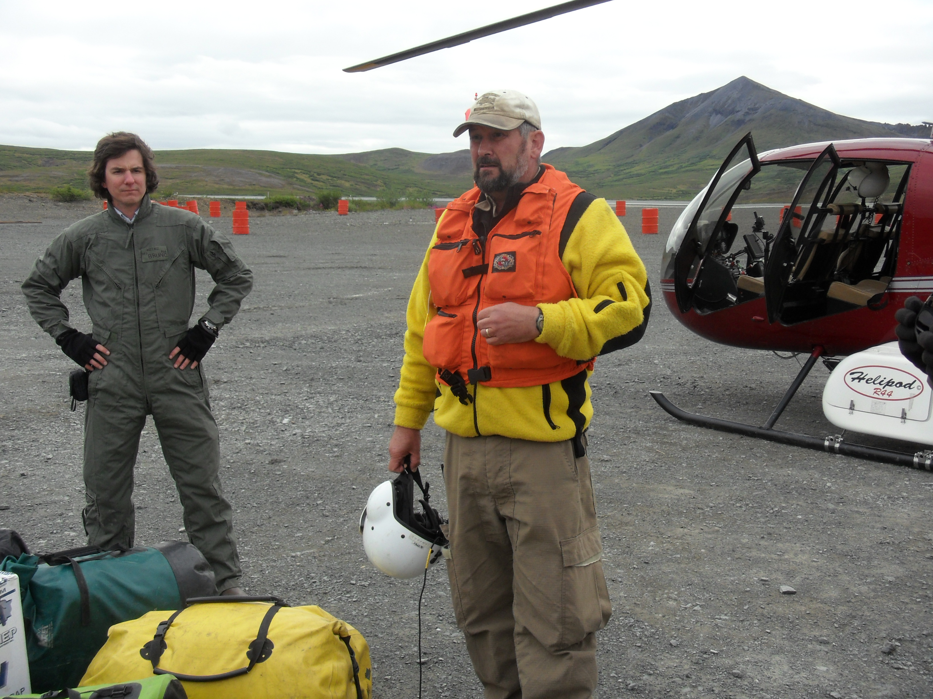 Archaeologist Stephan from Germany (left) and Bureau of Land Management employee Steve (right) prepare to take the helicopter out to the team's remote dig site. Note Stephan's fire-resistant Nomex flight suit and Steve's vest full of emergency supplies. Red Dog Mine, near Kotzebue, Alaska.