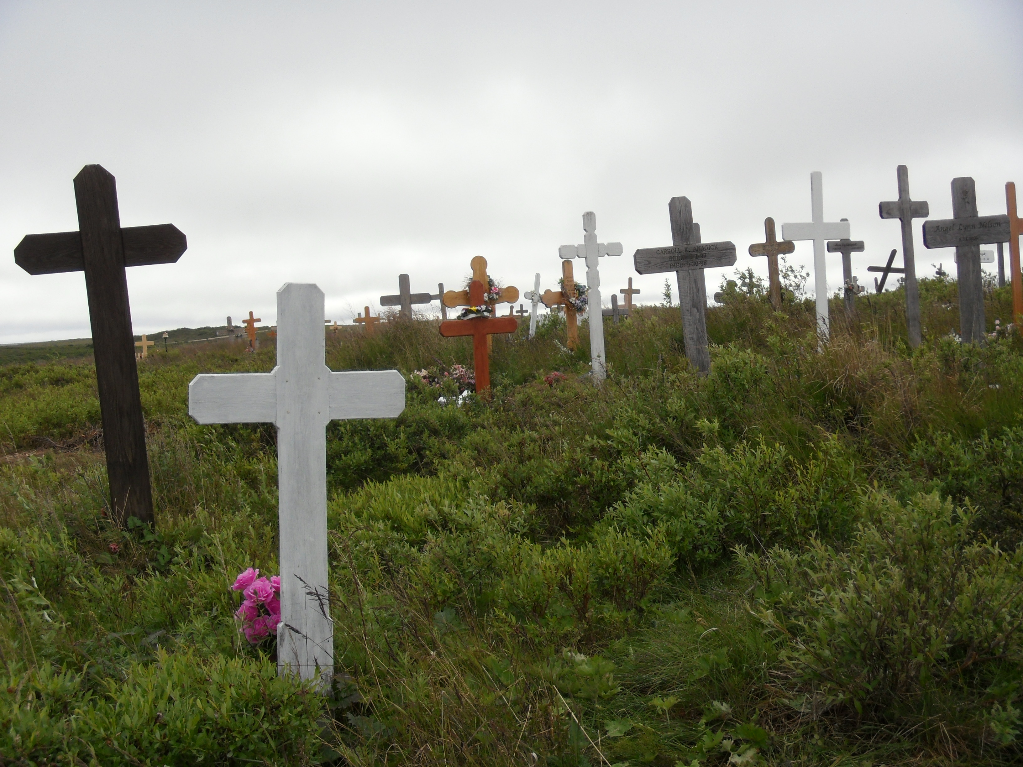 Karl Horeis: "The local people use large wooden crosses to mark their graves. These stand in tall green grass overlooking the Kotzebue airstrip." Kotzebue, Alaska.