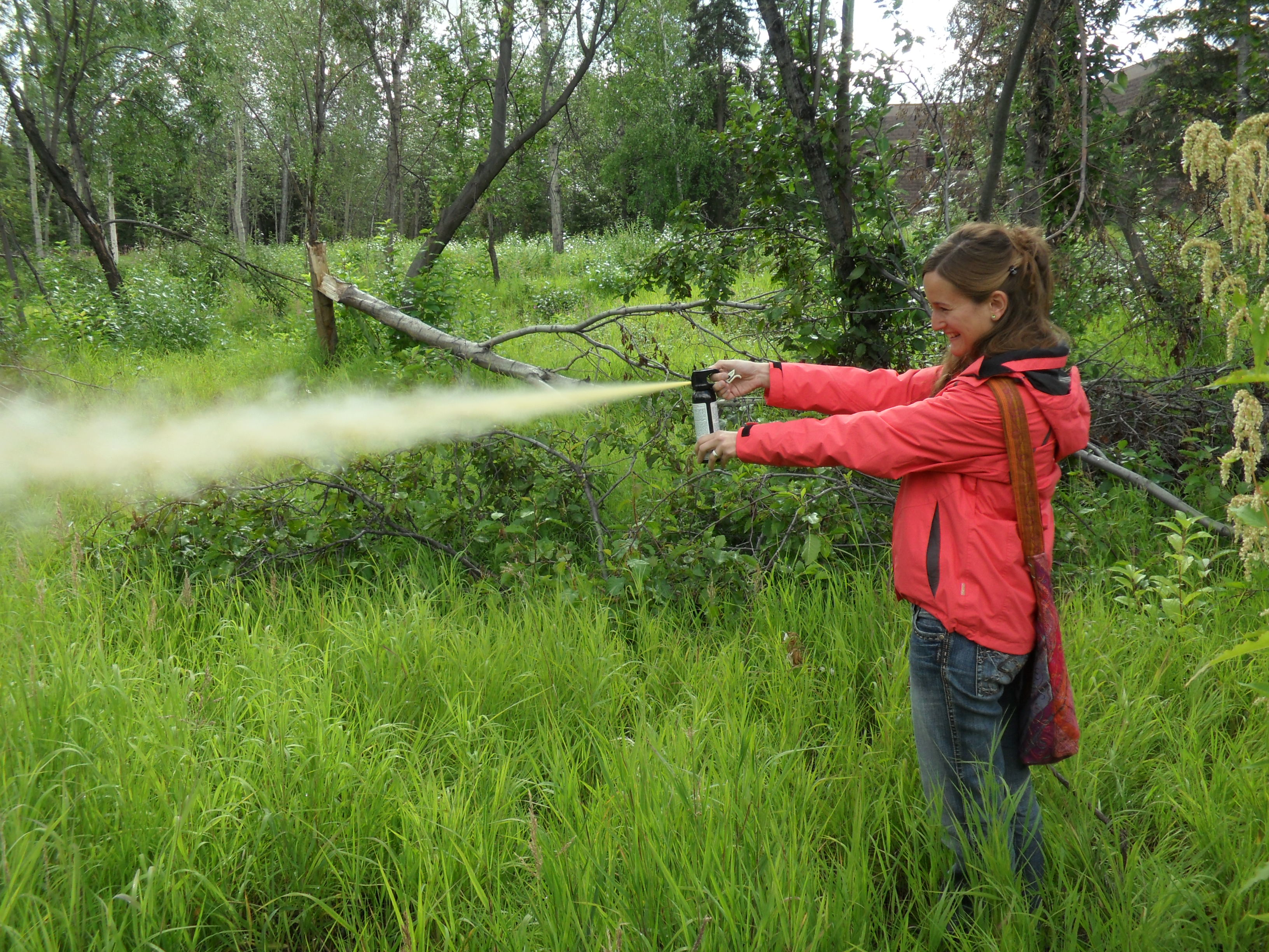 Ines, a German archaeology student from Cologne, is practicing spraying a bear with a pepper spray can. At the BLM headquarters in Fairbanks, Alaska.