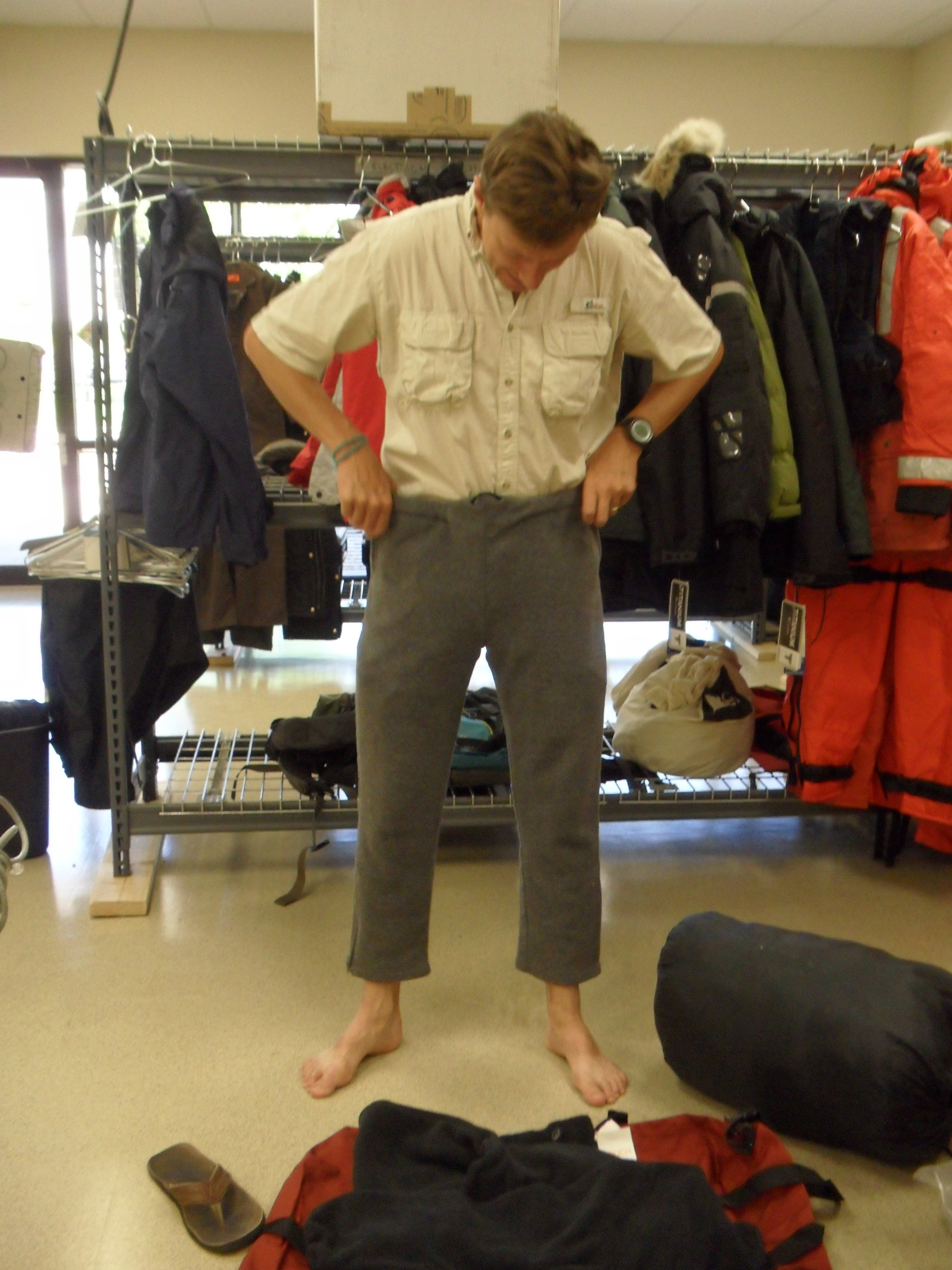 Karl Horeis: "These fleece pants might be just a tad short but they're nice and cozy none the less." Polar Field Services Warehouse, Littleton, Colorado.