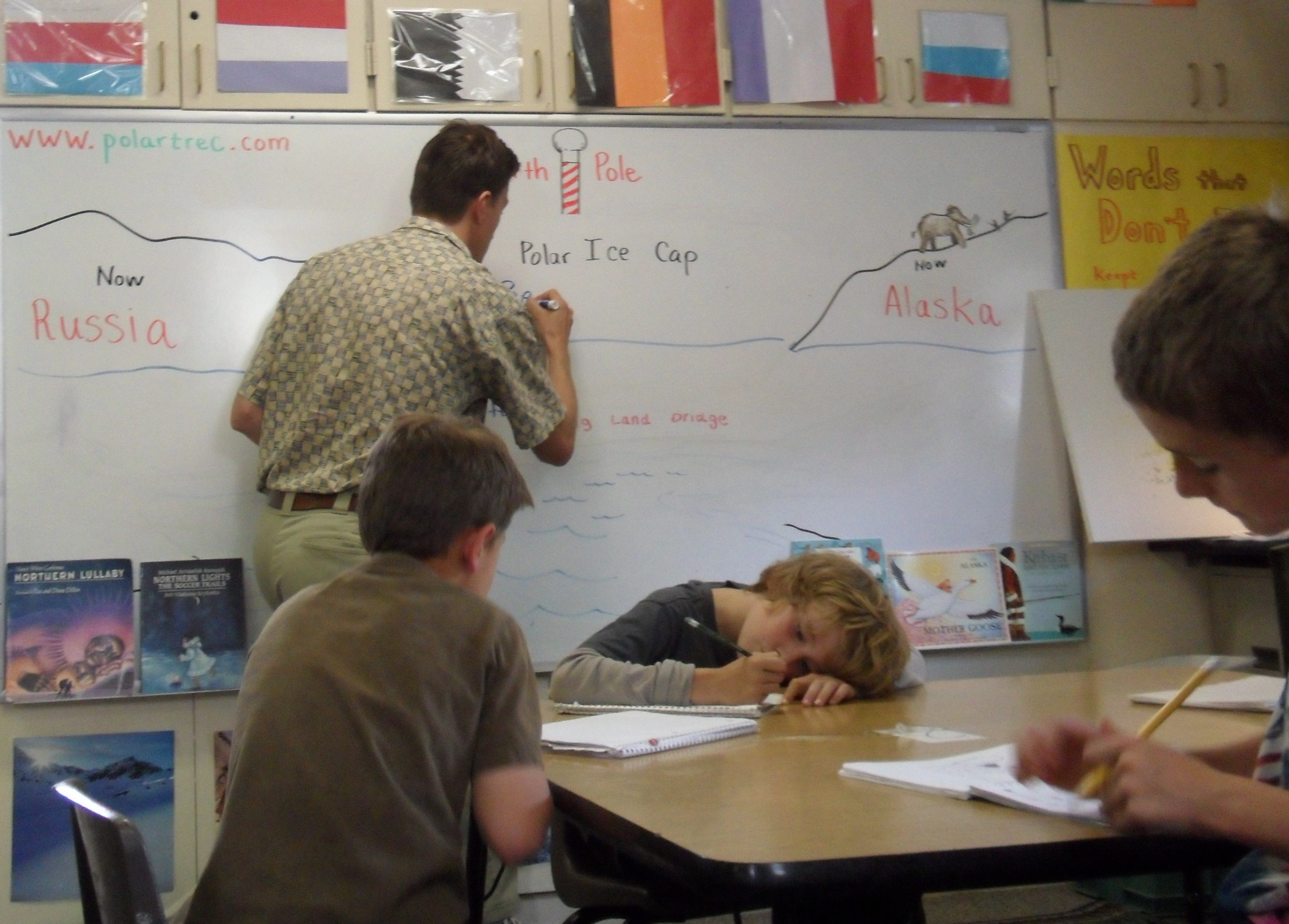 Students jot down notes about the theory of the Bering land bridge. Foothills Academy, Wheat Ridge, Colorado.
