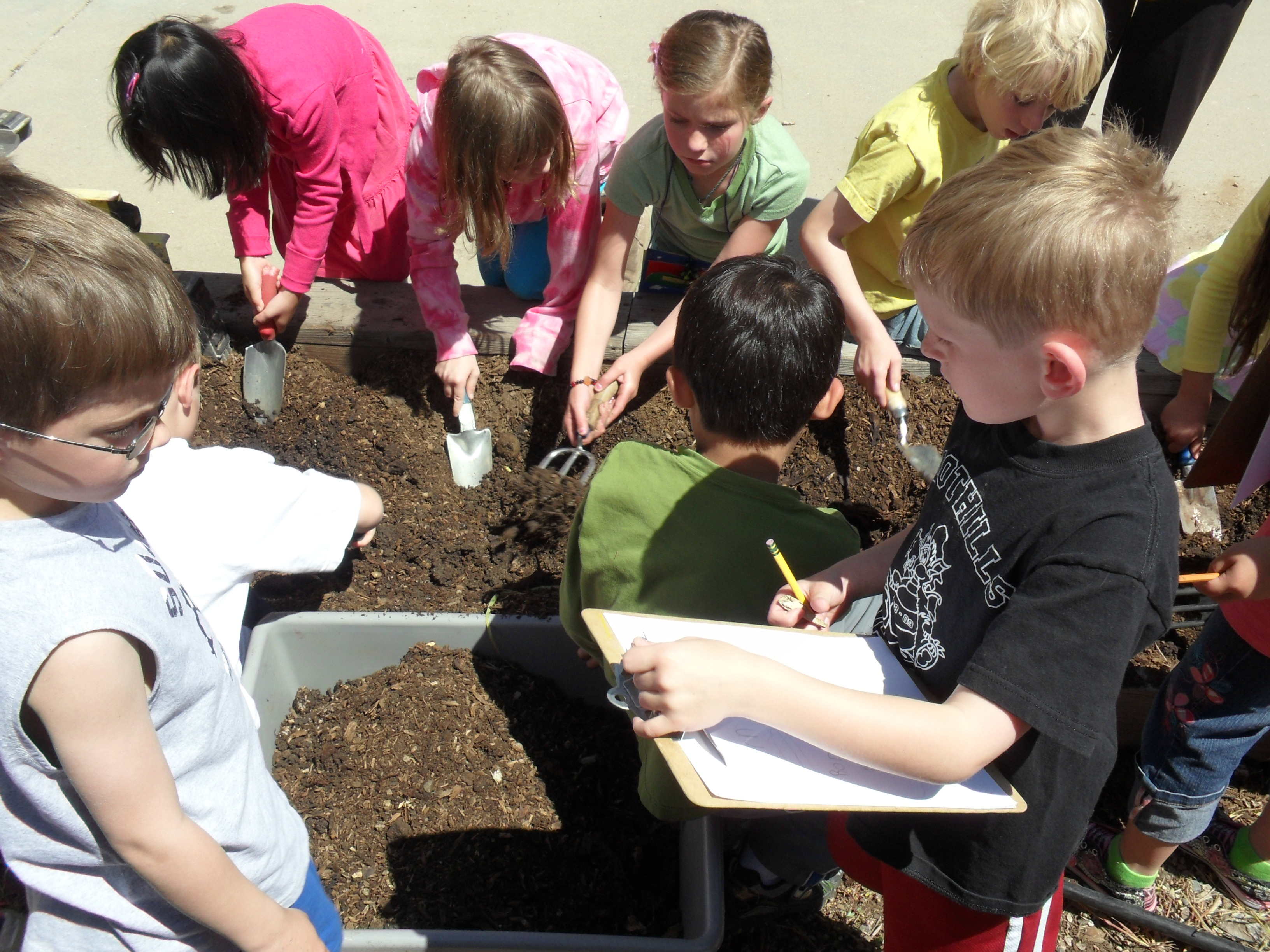 Karl Horeis: "The second graders at Foothills Academy had fun searching out in the garden boxes for (pre-planted) obsidian chunks and stone tools. Note Kyle in the foreground carefully taking notes about everything that was found." Foothills Academy, Wheat Ridge, Colorado.