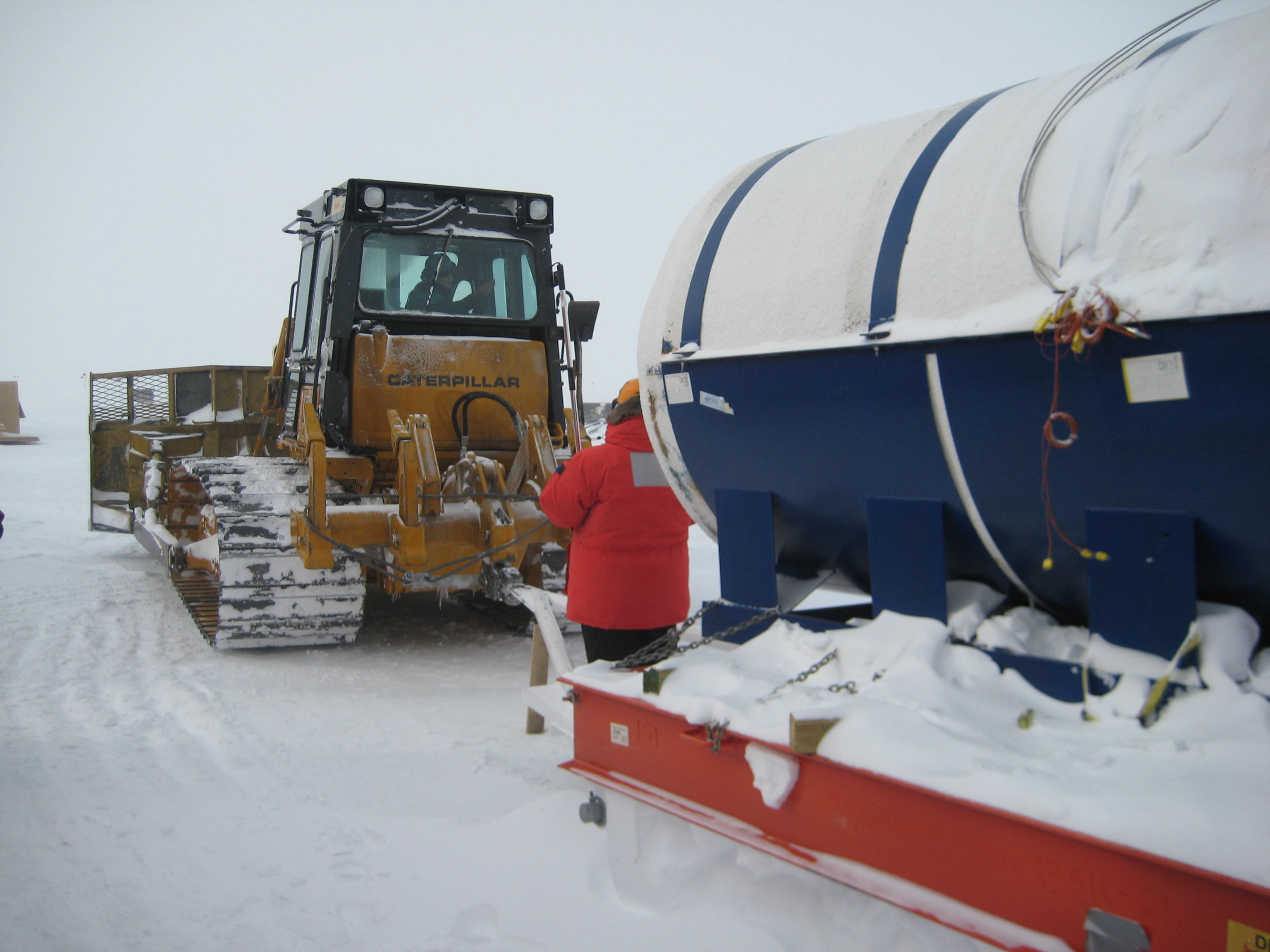 Katey Shirey: "The water buffalo is attached to a tractor so that it can be taken to the trench." Amundsen–Scott South Pole Station, Antarctica.