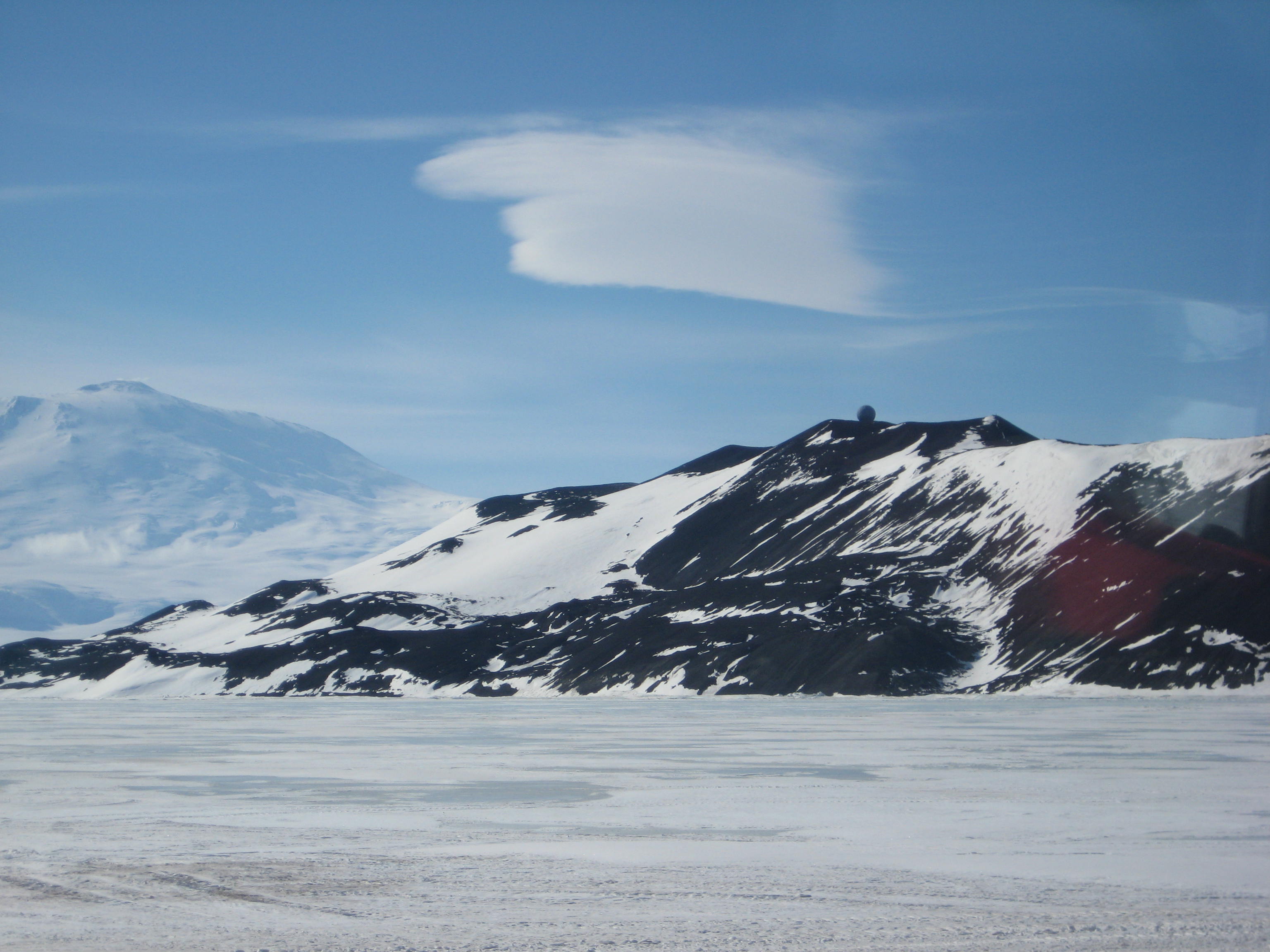 A view of Mount Erebus with two observations outposts visible. McMurdo Station, Antarctica.