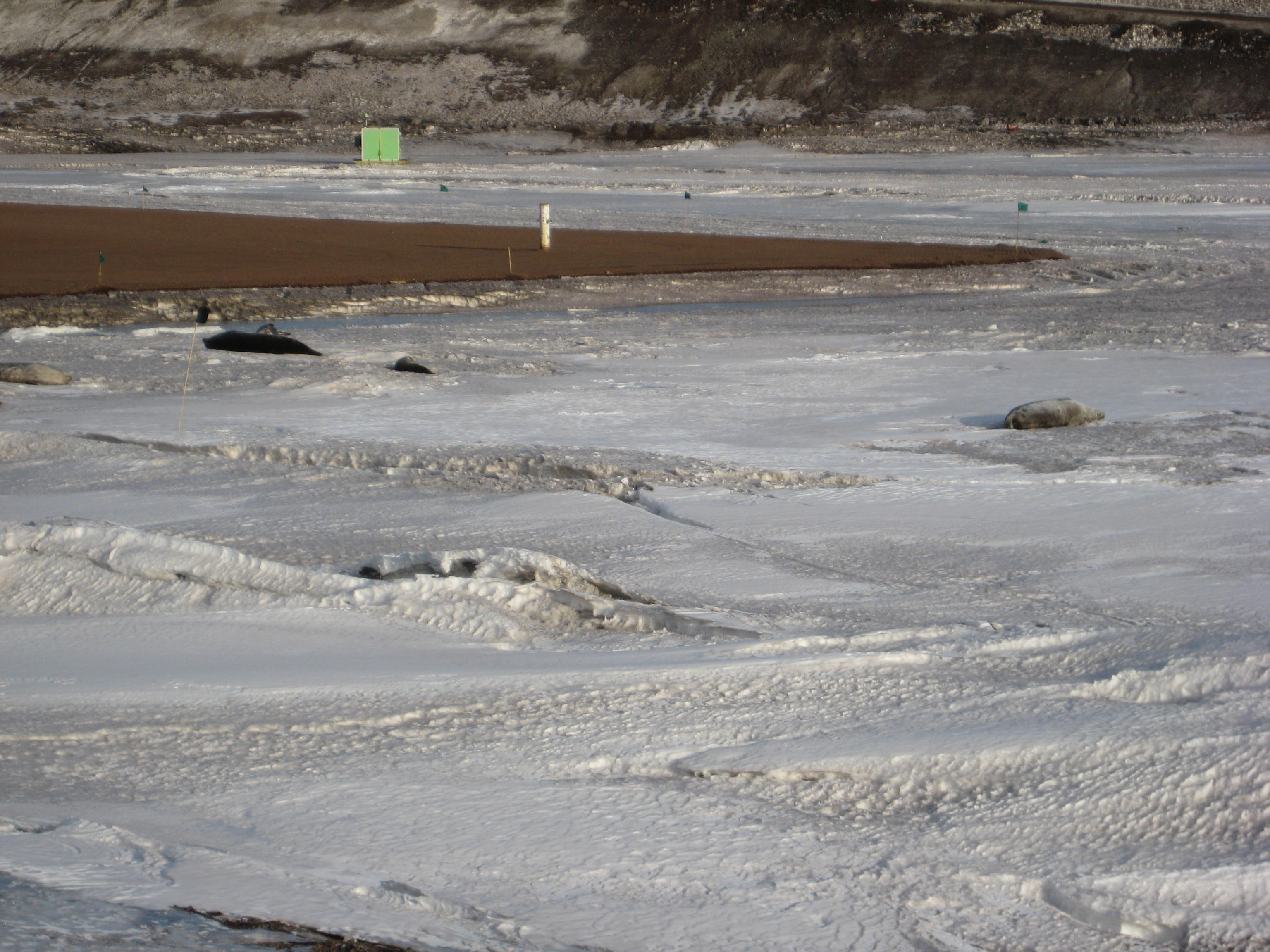 Here are four seals on the sea ice. A total of six seals, including a baby, were basking on the sea ice. Near McMurdo Station, Antarctica.