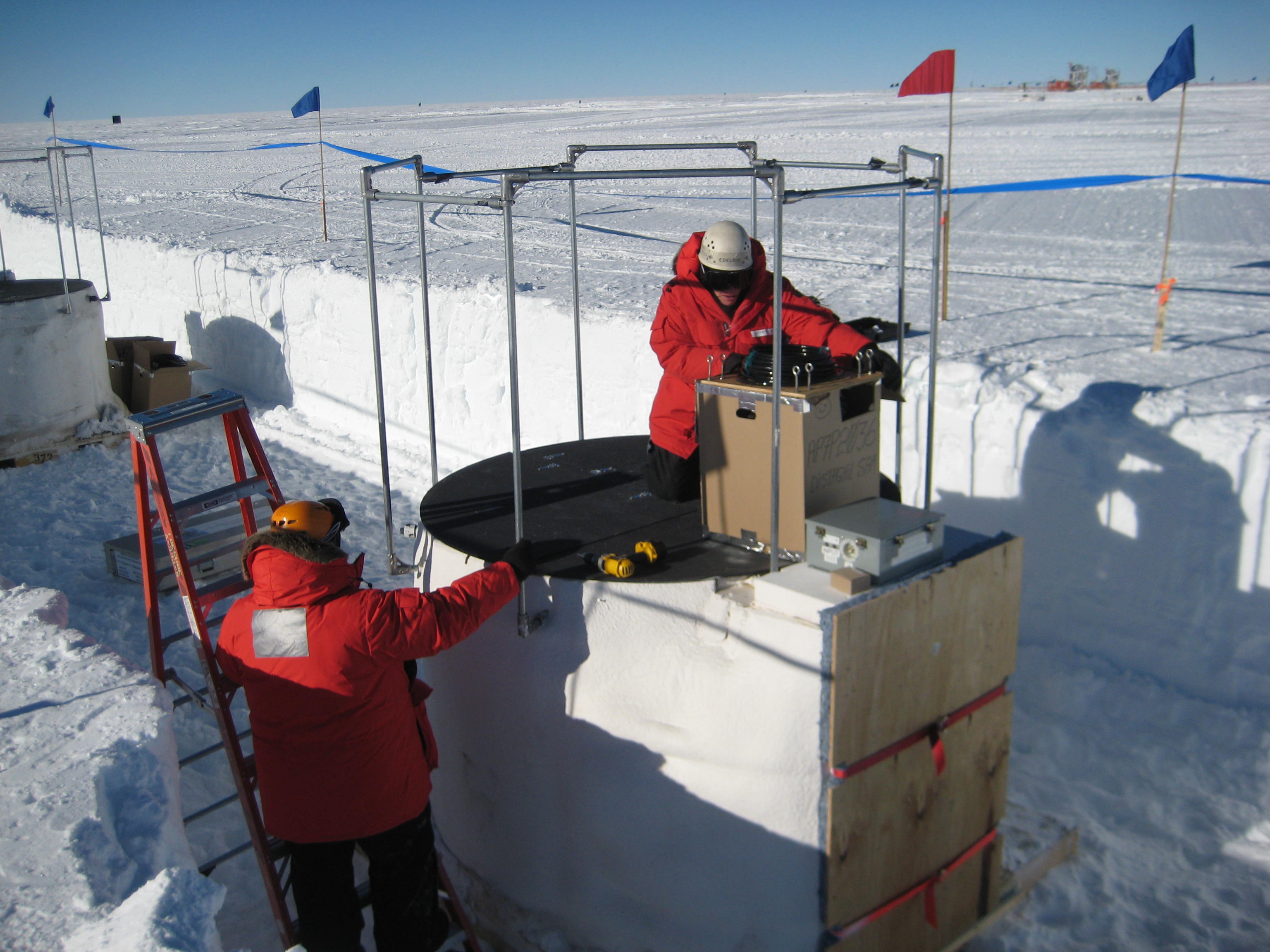 Chris Elliott and Bakhityar Ruzybayev work to get a DOM (Digital Optical Module) into a tank. In this photo: Chris Elliott and Bakhityar Ruzybayev. Amundsen–Scott South Pole Station, Antarctica.