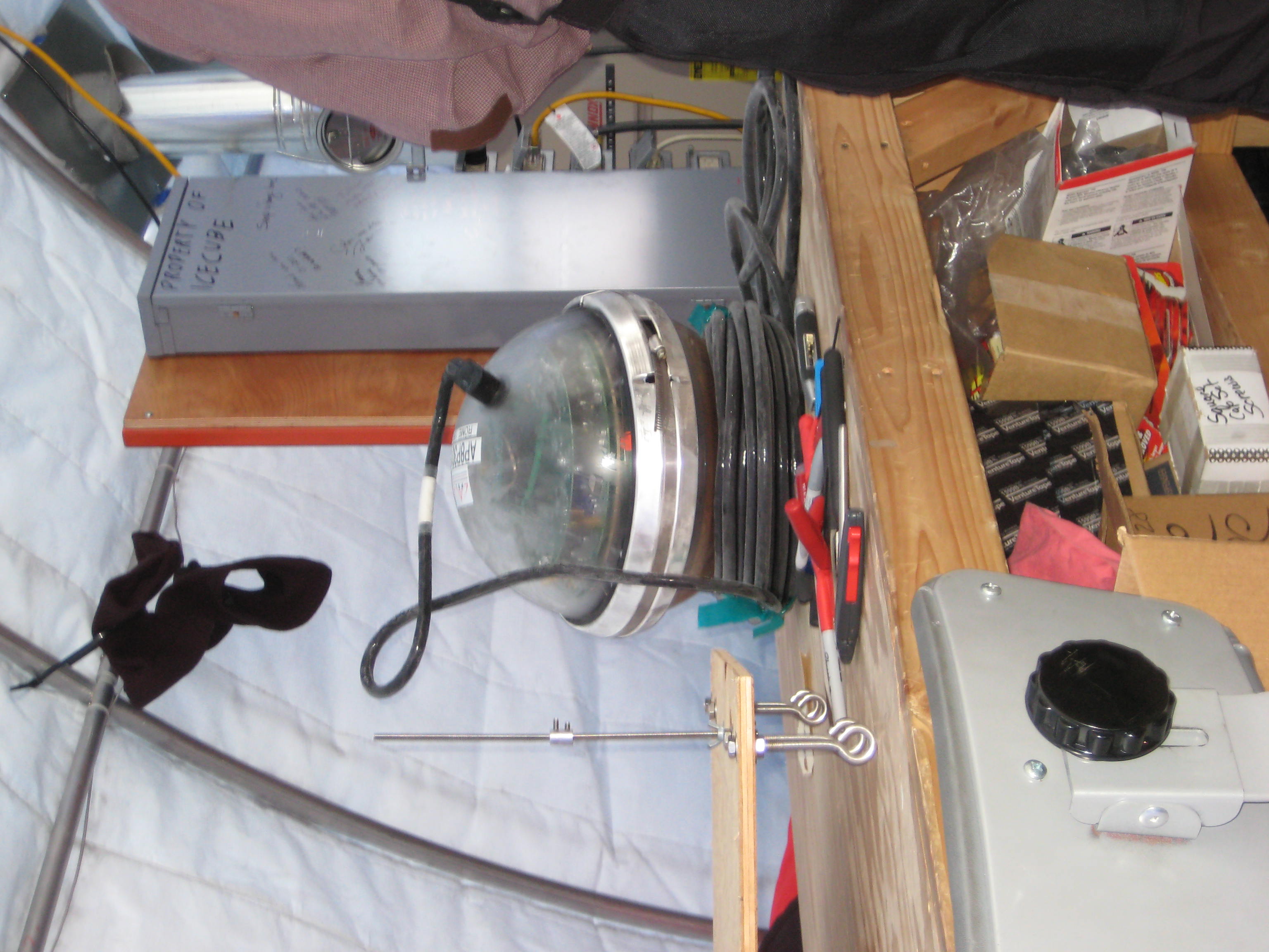This DOM (Digital Optical Module) is ready to be mounted on to a board. It has circuit boards on the top half and a large photodetector on the bottom half. The 17m cord connects it to power and computers. Amundsen–Scott South Pole Station, Antarctica.