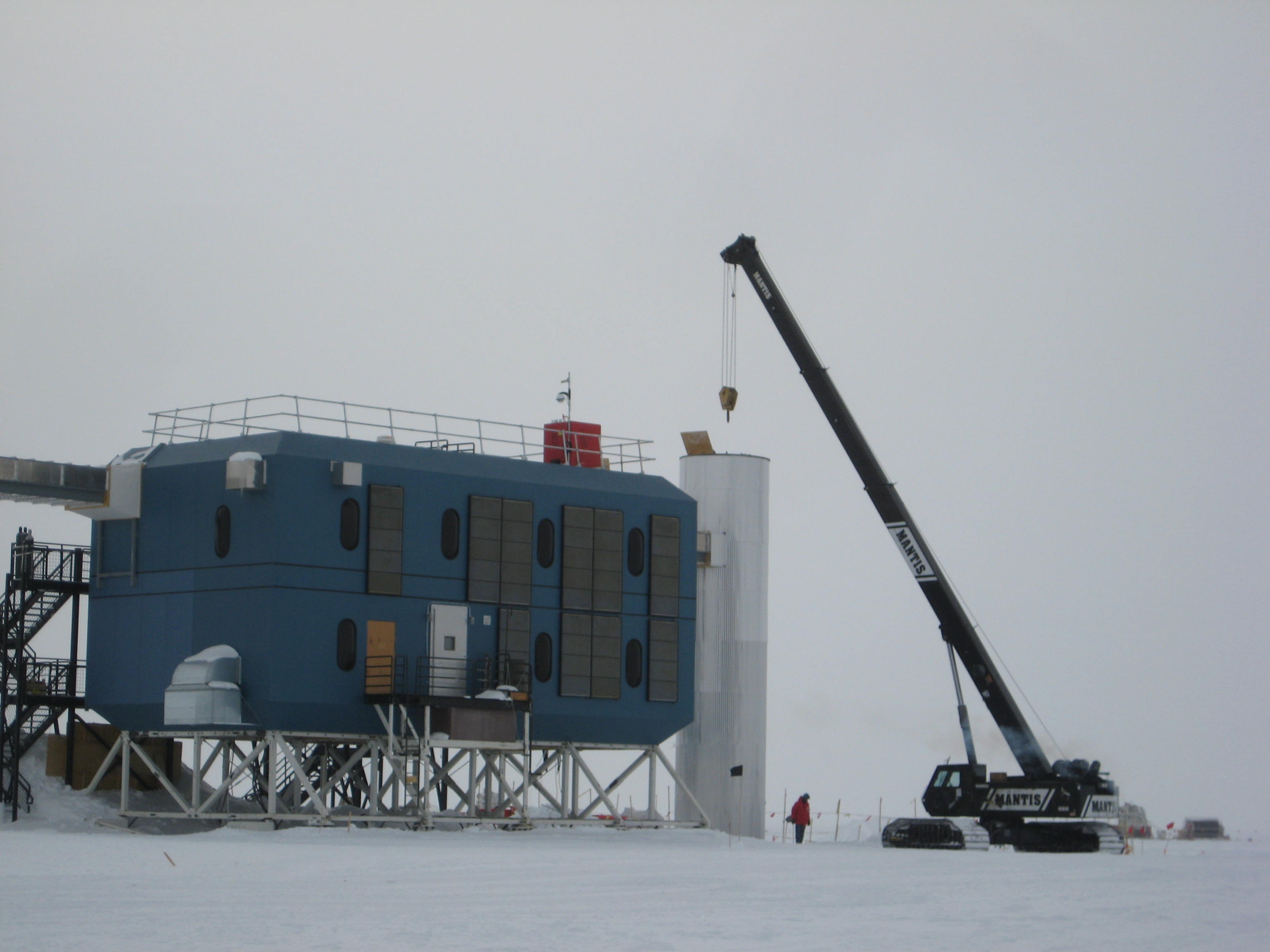 A large crane lifts and sets the cover back on the IceCube Lab. Amundsen–Scott South Pole Station, Antarctica.