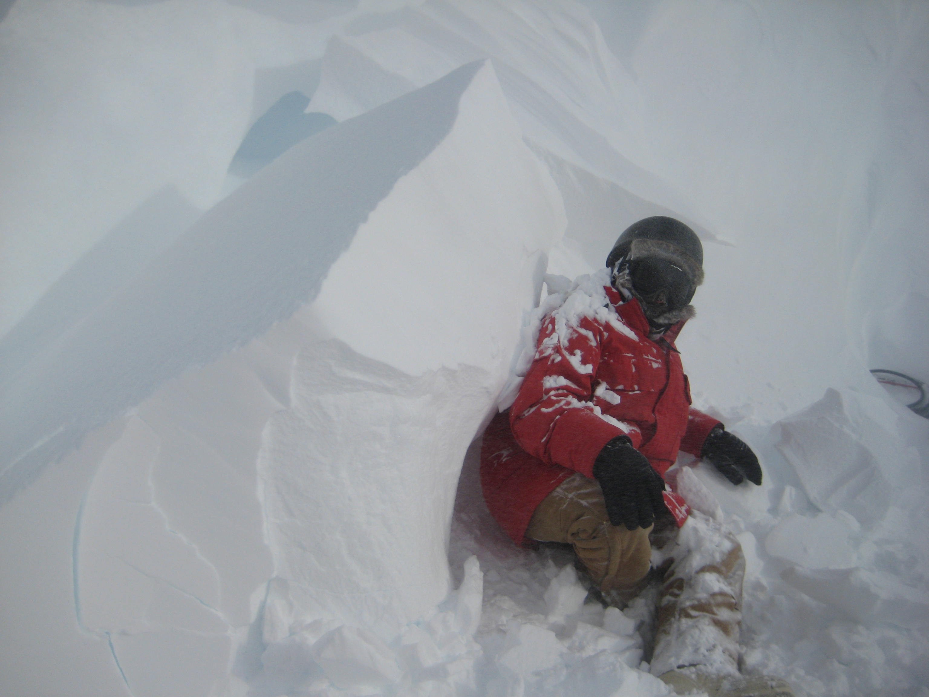 James Roth poses with an collapsed snow overhang. Overhangs can be unstable if disturbed. Amundsen–Scott South Pole Station, Antarctica.