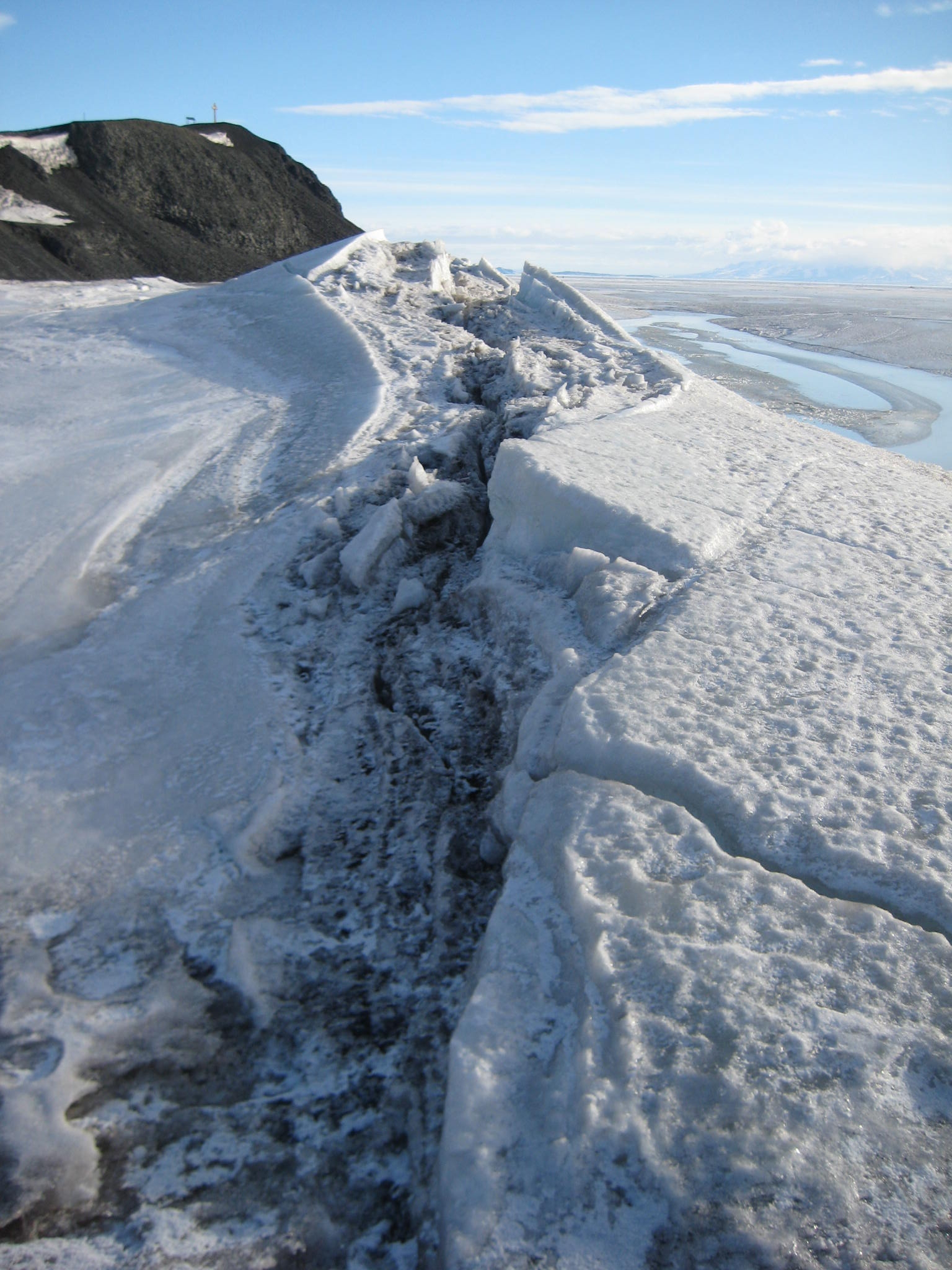 A compression ridge in the sea ice caused by the sea ice pushing inland. Near McMurdo Station, Antarctica.