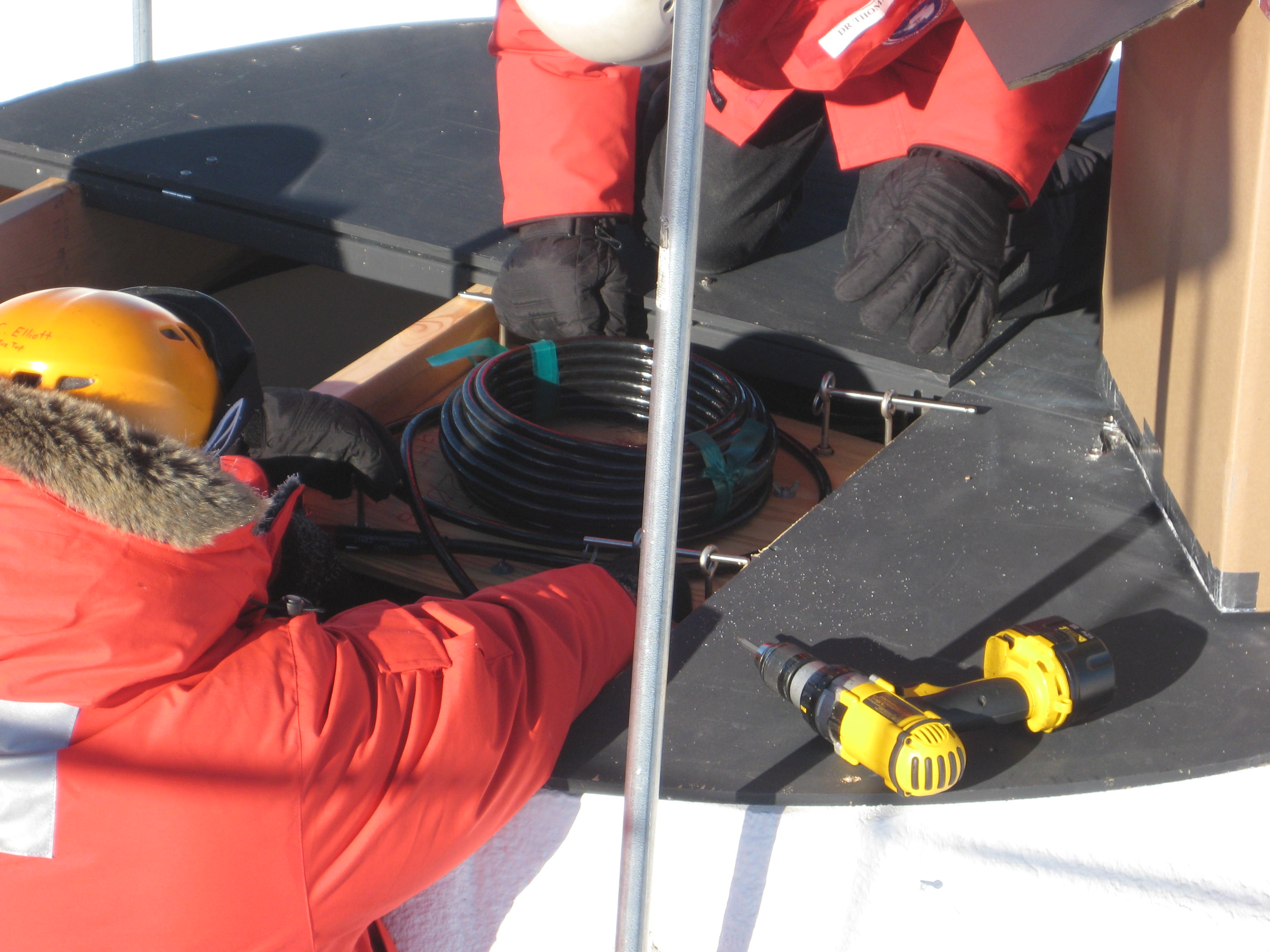 Chris Elliott and Bakhityar Ruzybayev suspend a DOM (Digital Optical Module) from a wooden frame so that it hangs into an empty tank. Amundsen–Scott South Pole Station, Antarctica.