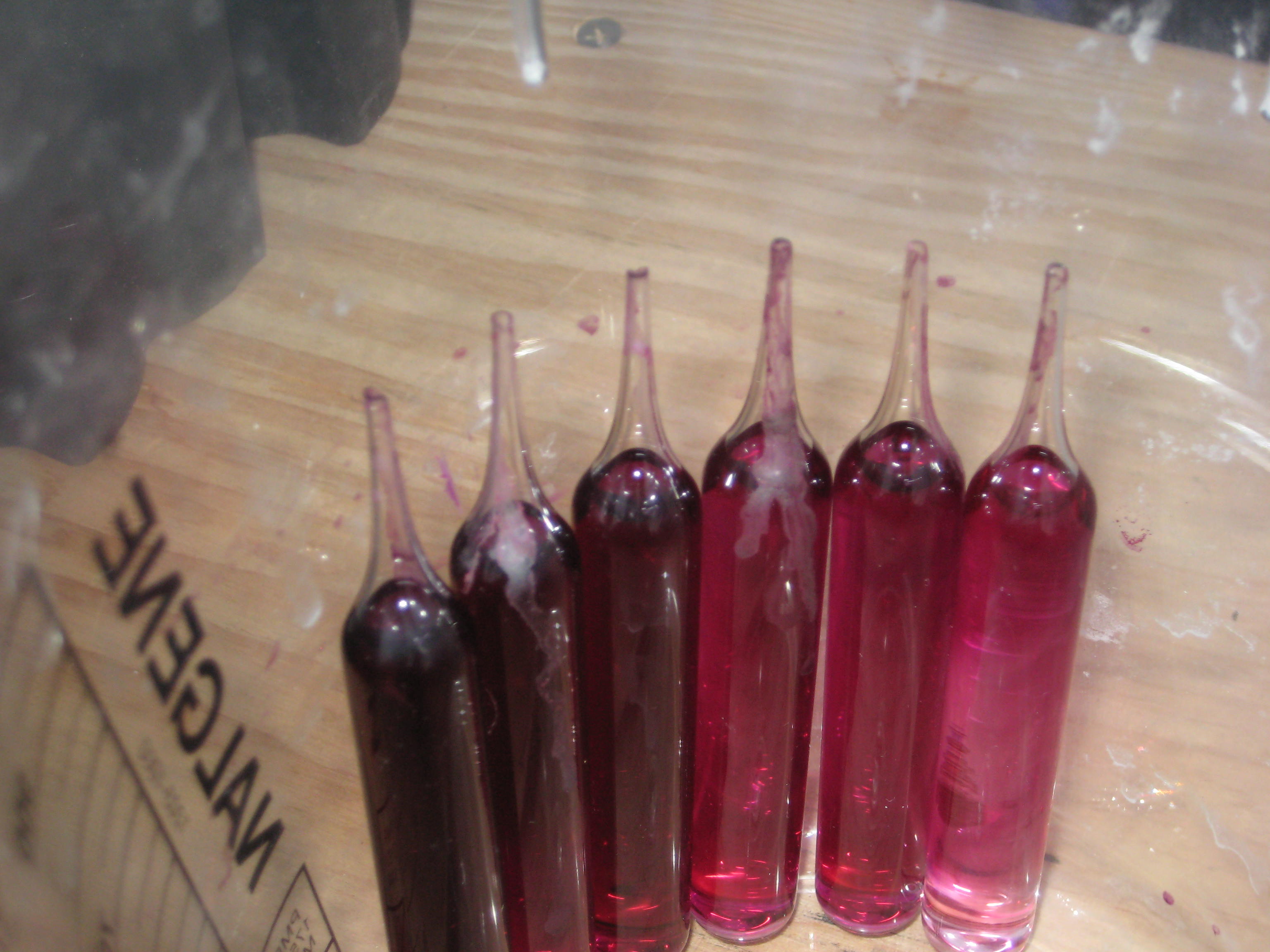 Propylene glycol (antifreeze) test tubes. The darker the color, the more propylene glycol is present. Amundsen–Scott South Pole Station, Antarctica.