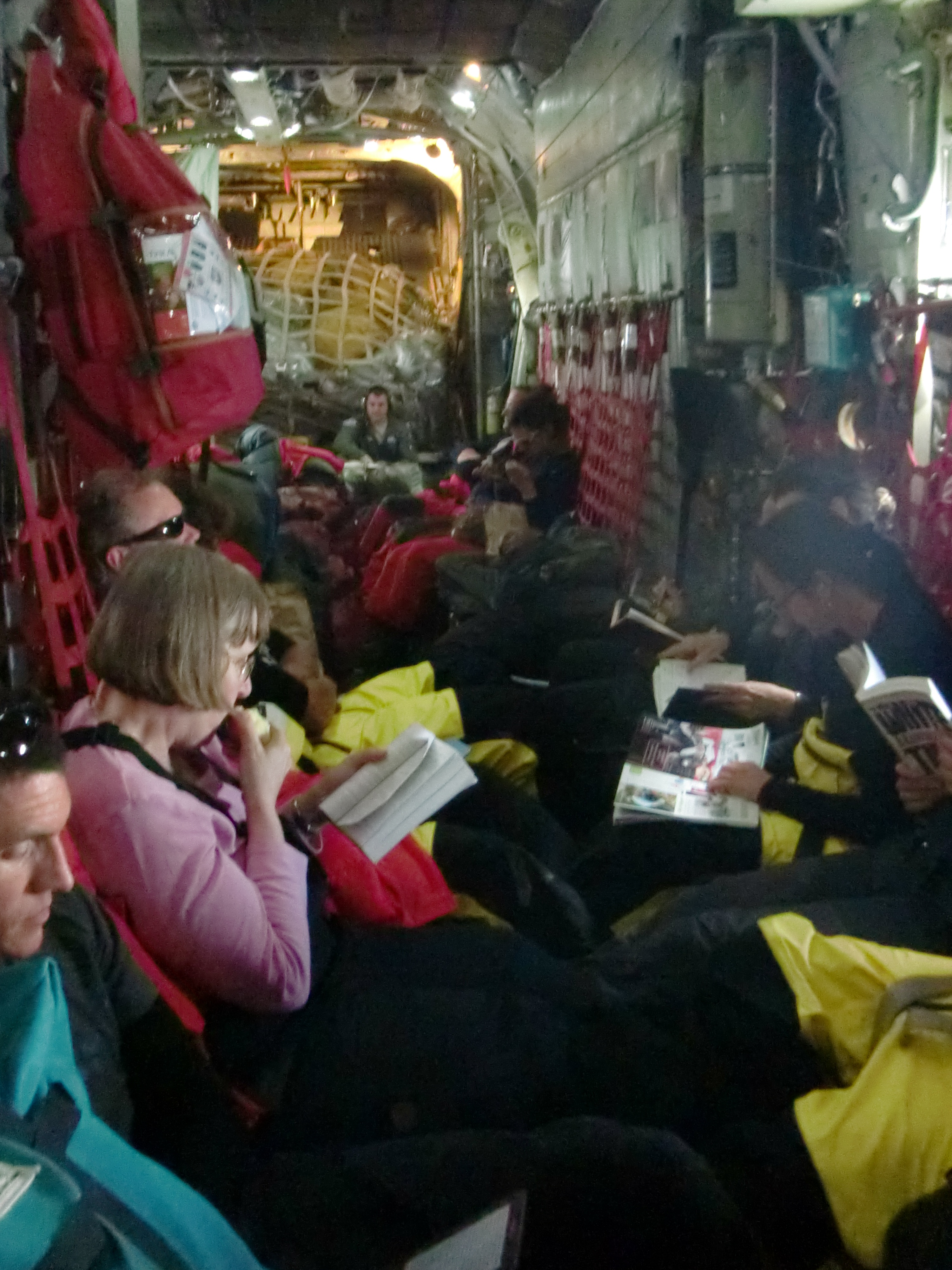 A view down the aisle of the LC-130. Aboard the LC-130, over the Southern Ocean.