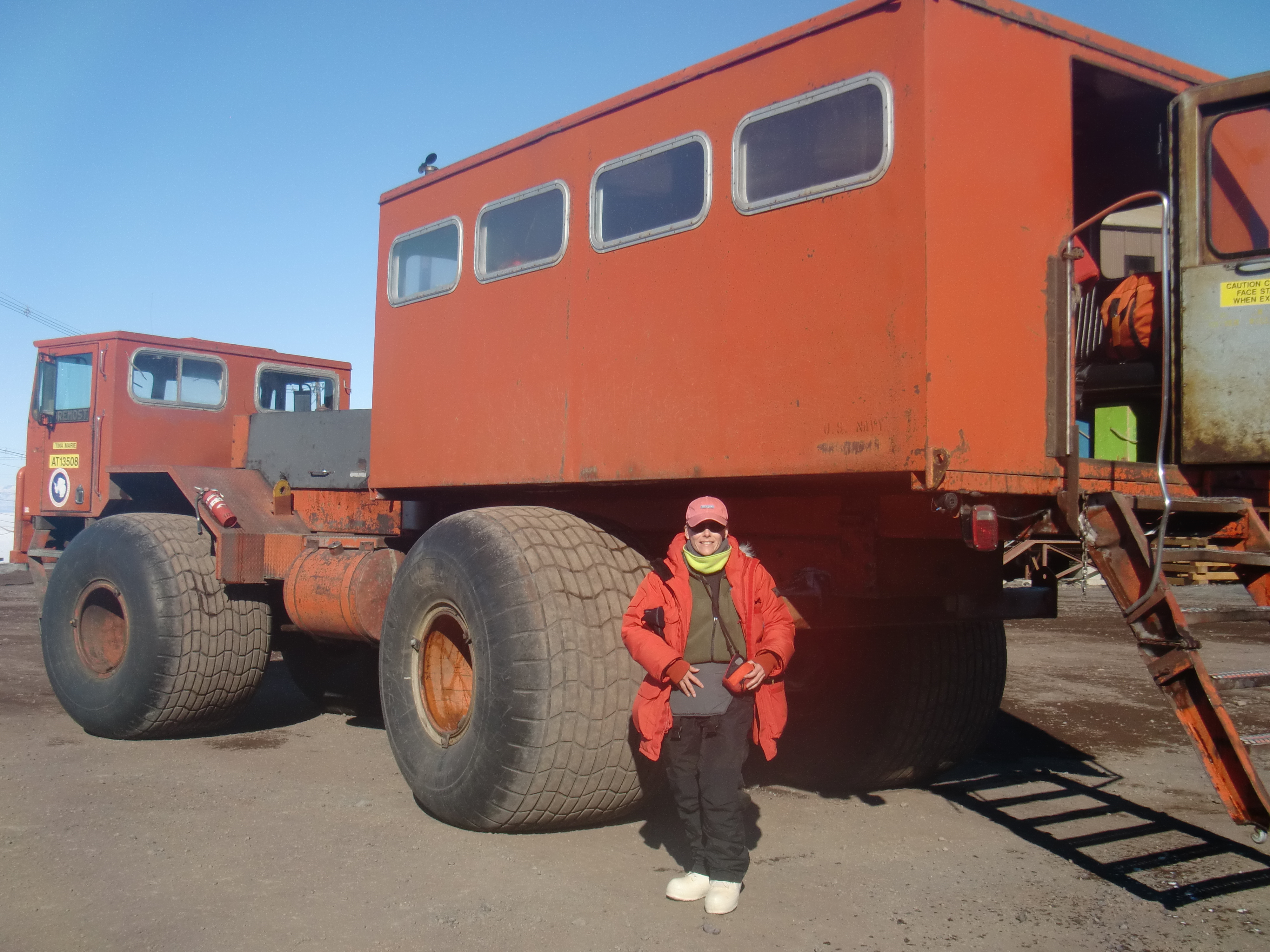 Alex Eilers stands by the large wheels of the Delta transport vehicle. McMurdo Station, Antarctica.