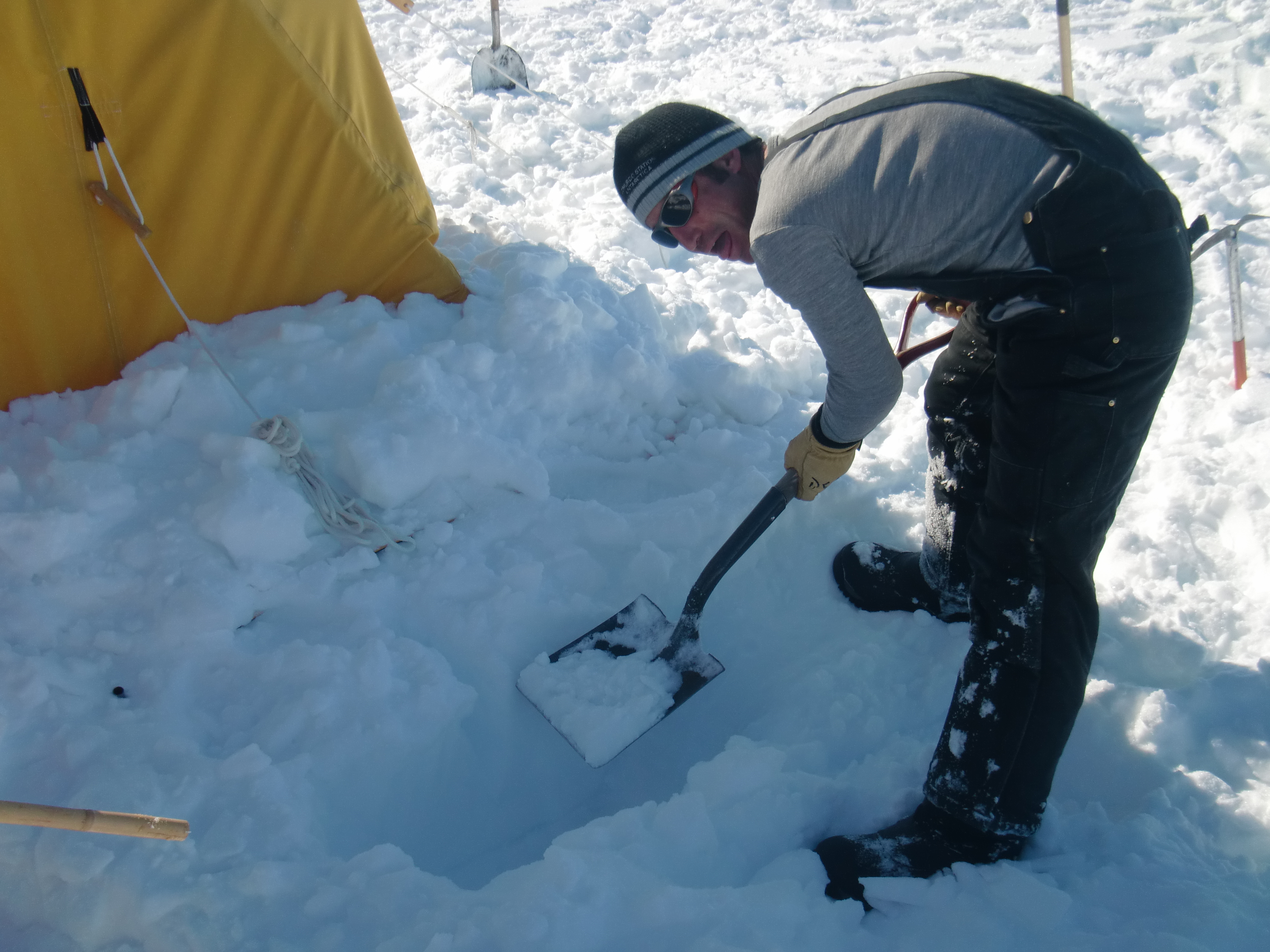 Staking the tent down -- step one: Dig a hole in the snow. Be sure to carve a notch for the rope. At the Happy Camper Schoo, near McMurdo Station, Antarctica.
