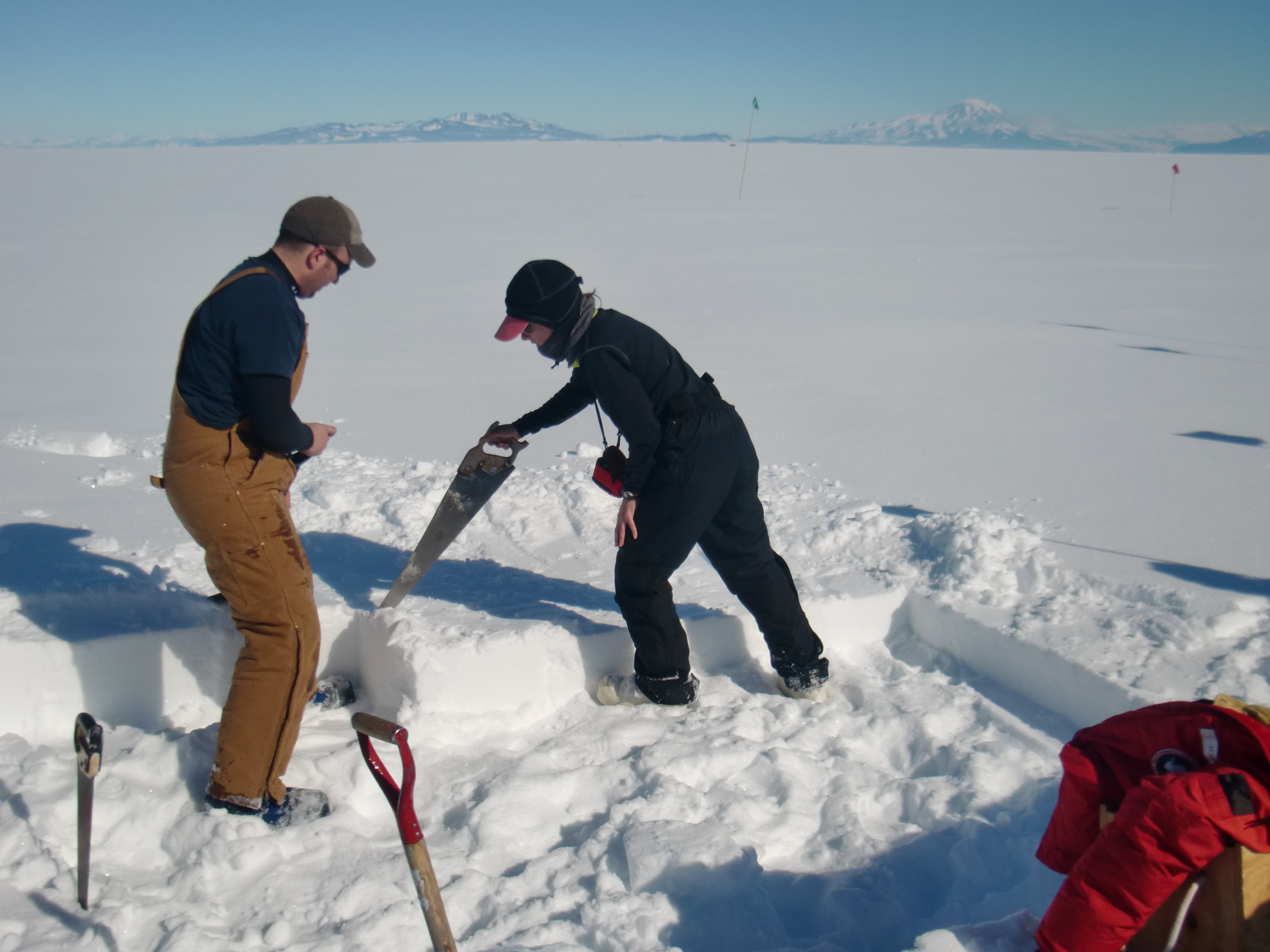 Alex Eilers cuts snow blocks for the snow wall that will form a wind break for the tents. At the Happy Camper Schoo, near McMurdo Station, Antarctica.