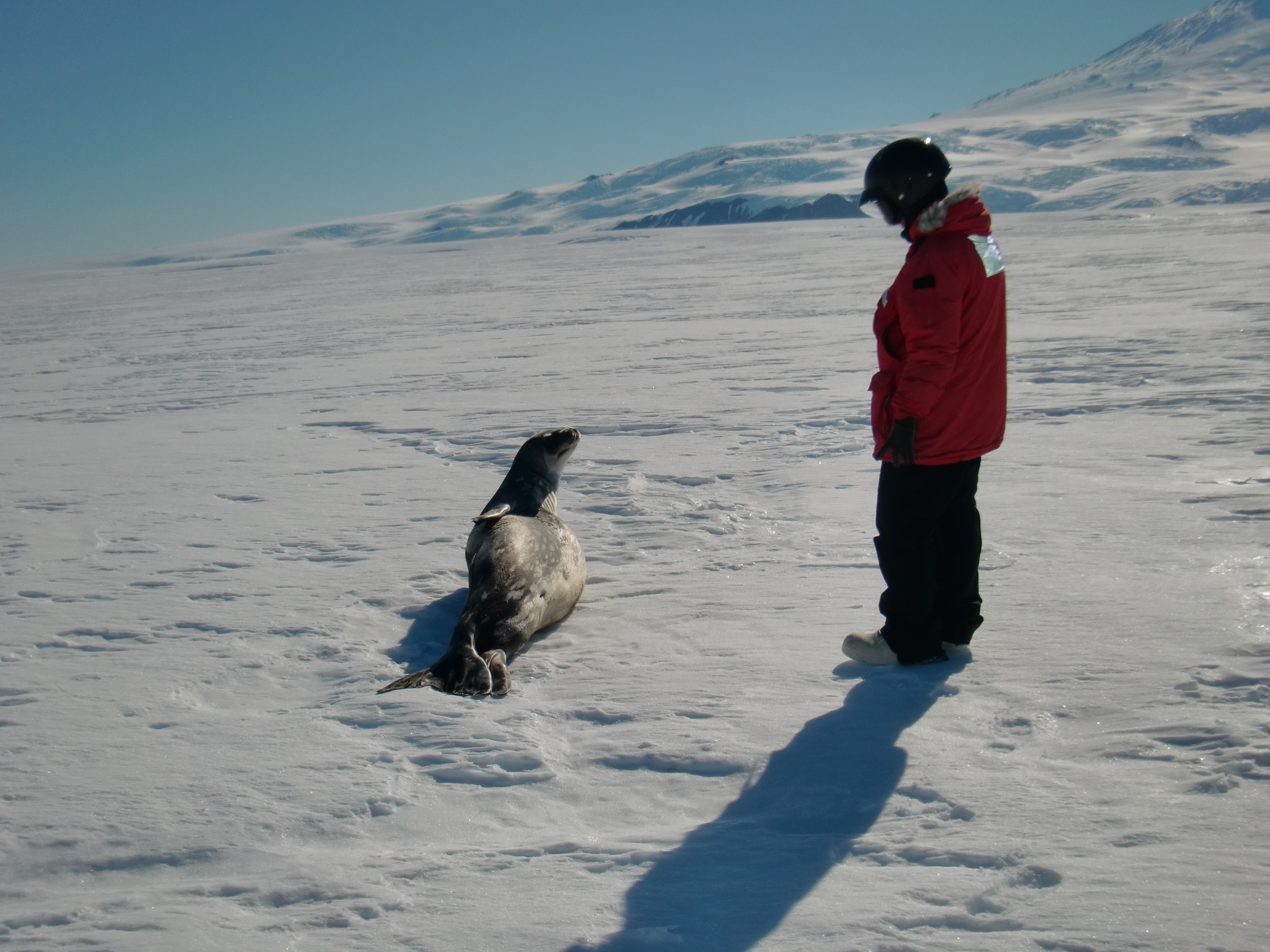 Graduate student Kim talks to the Weddell seal. The seal looks back at the scientist with apparent curiosity. Turtle Rock, Antarctica.