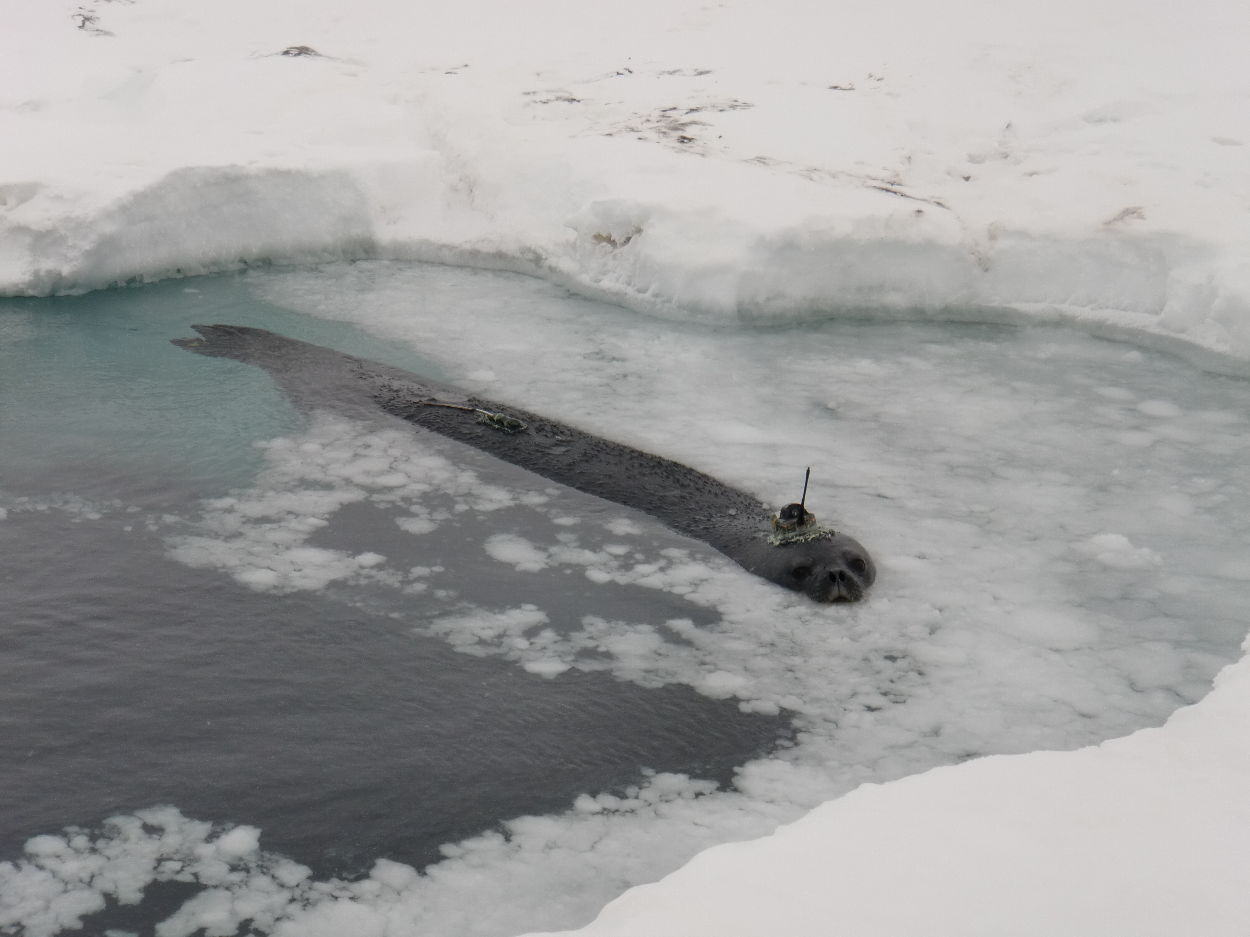 The seal swims around with the tags attached. Near Scott Base, Antarctica.