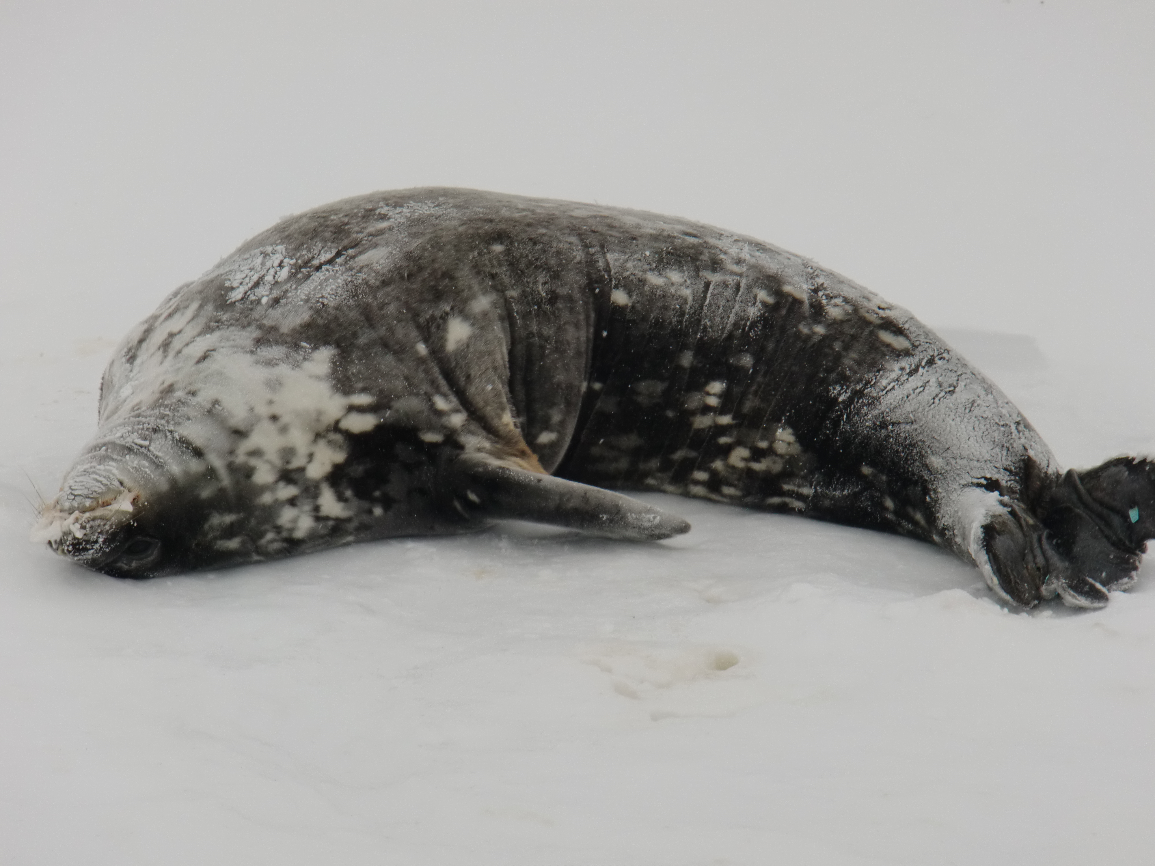 A Weddel seal lays on its back on the sea ice. Near Scott Base, Antarctica.