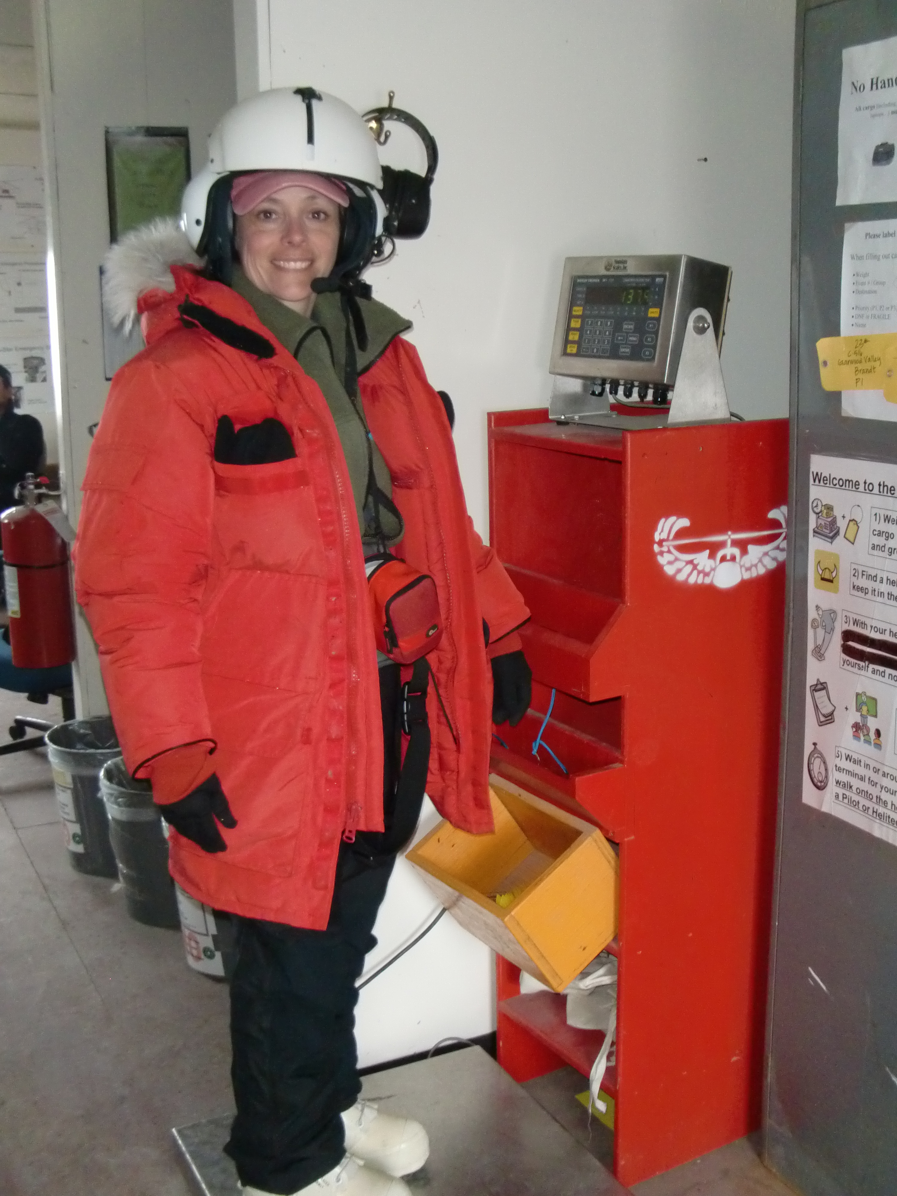 Alex Eilers in her red parka, just before a helicopter flight to see Adélie penguins. McMurdo Station, Antarctica.