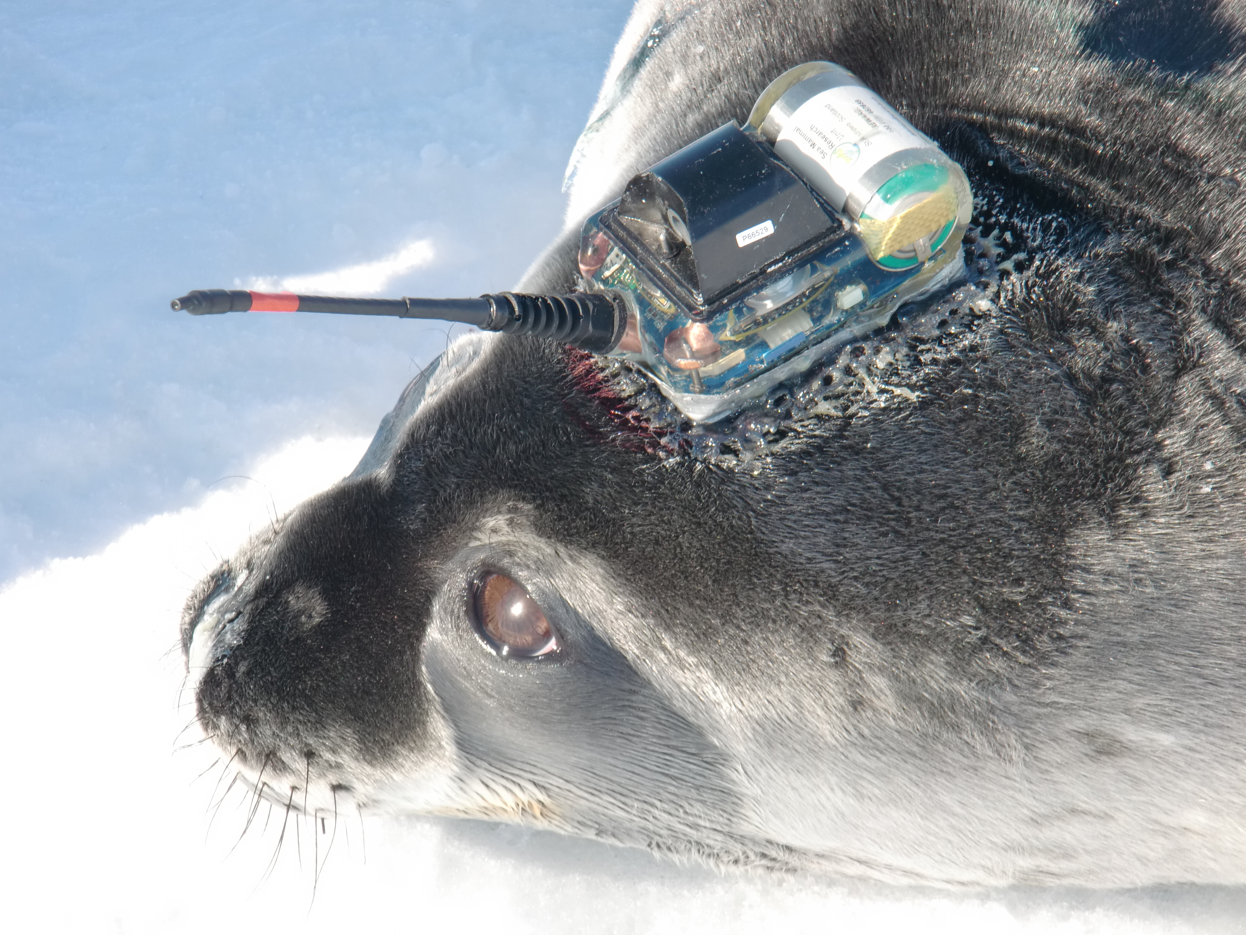A Weddell seal with a satellite tag attached. Near Granite Harbour, Antarctica.