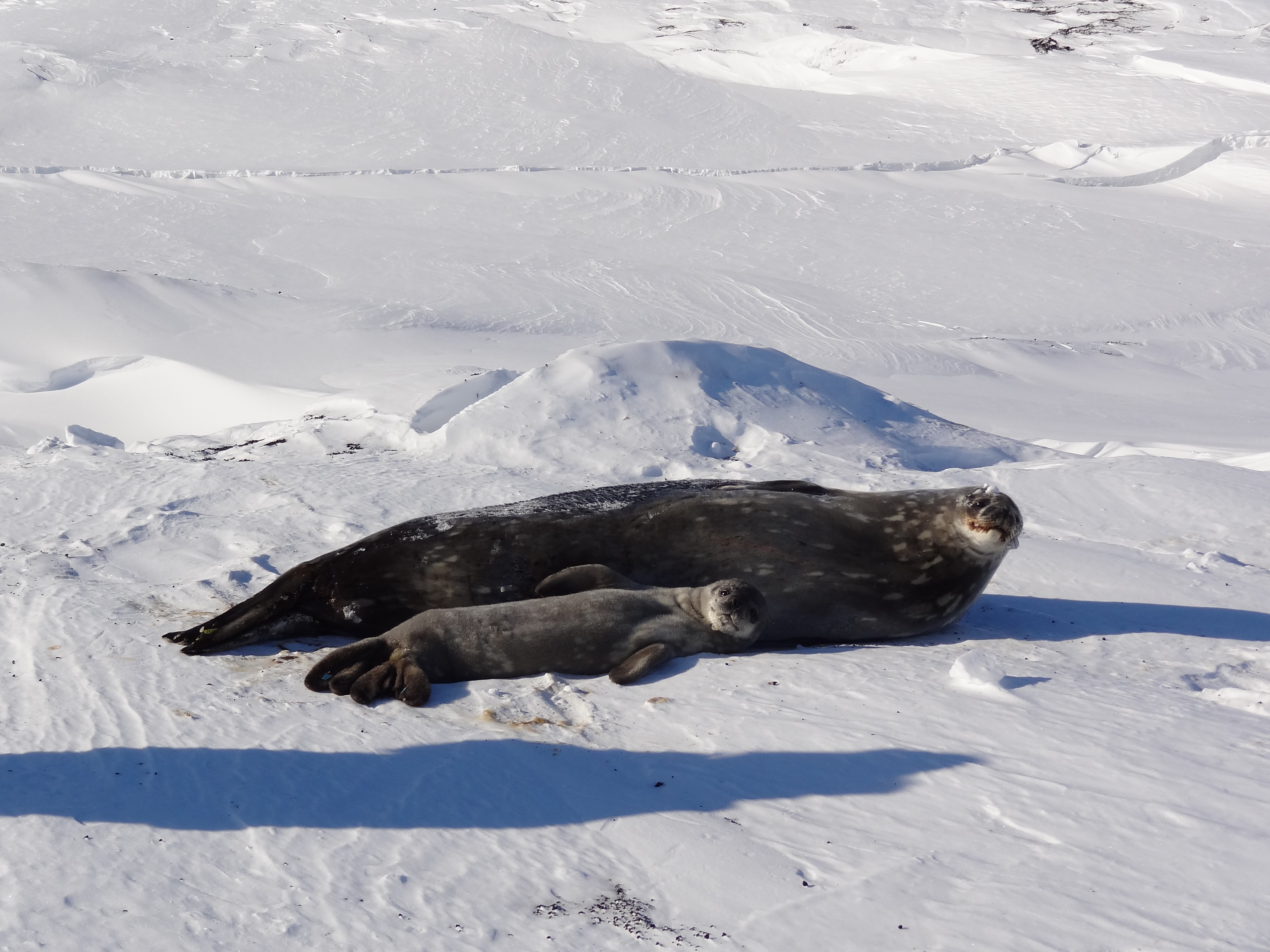 A mother Weddell seal with her pup. McMurdo Station, Antarctica.