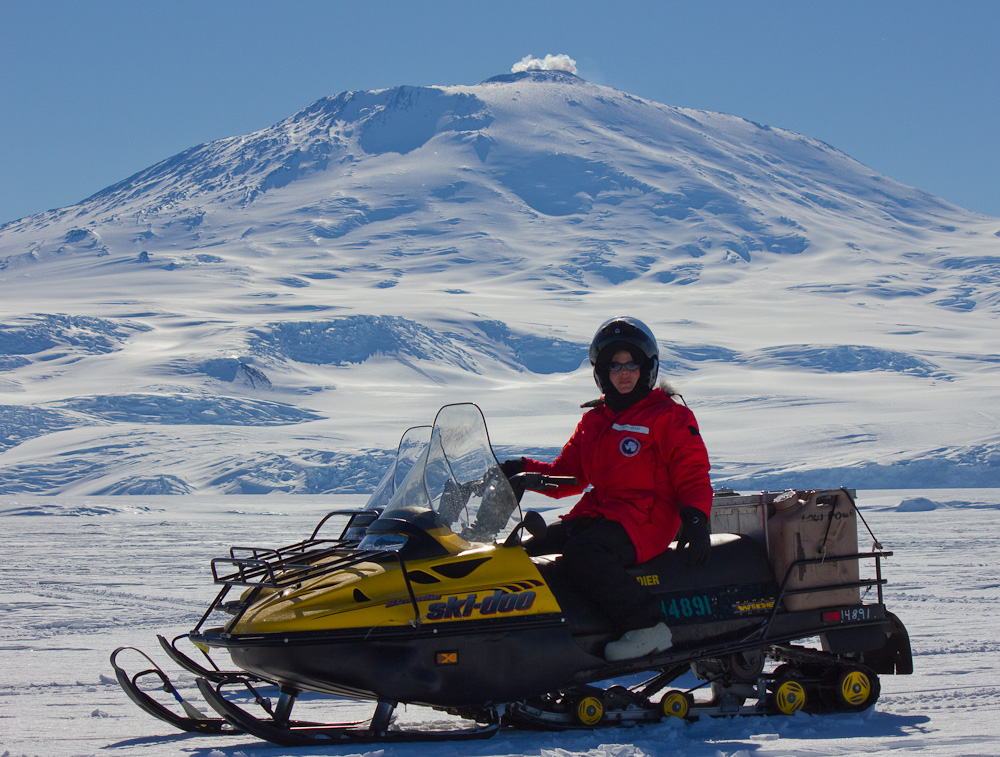 Alex Eilers on a snowmobile in front of Mount Erebus. Near Turtle Rock, Antarctica.