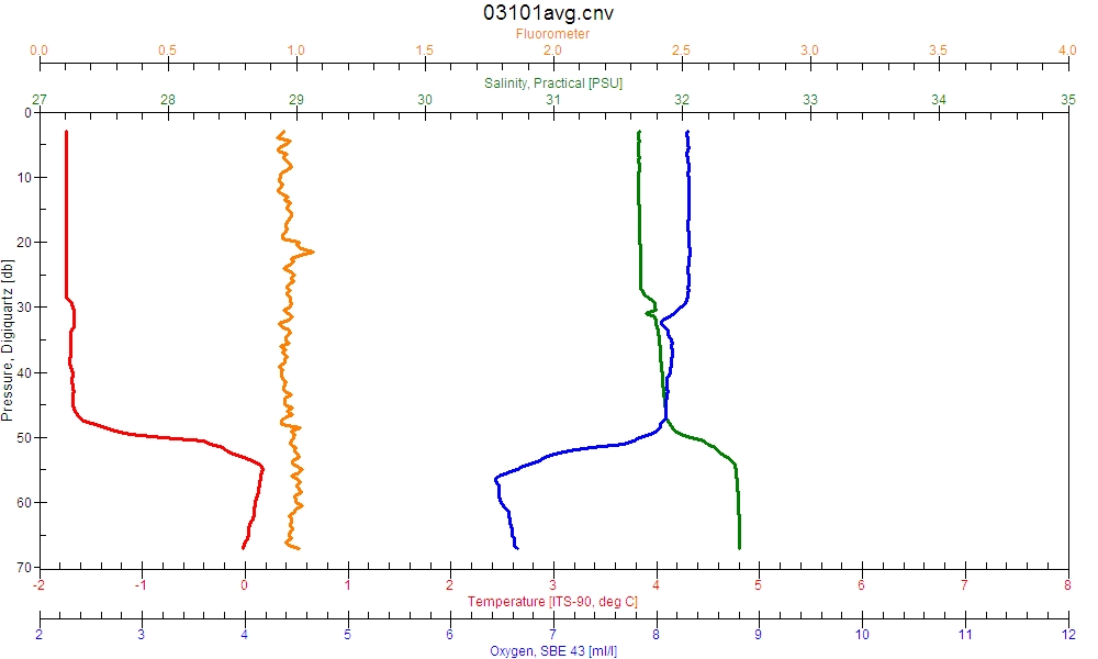 A CTD (Conductivity, Temperature, and Depth instrument) graph. Aboard the USCGC Healy icebreaker in the main lab.