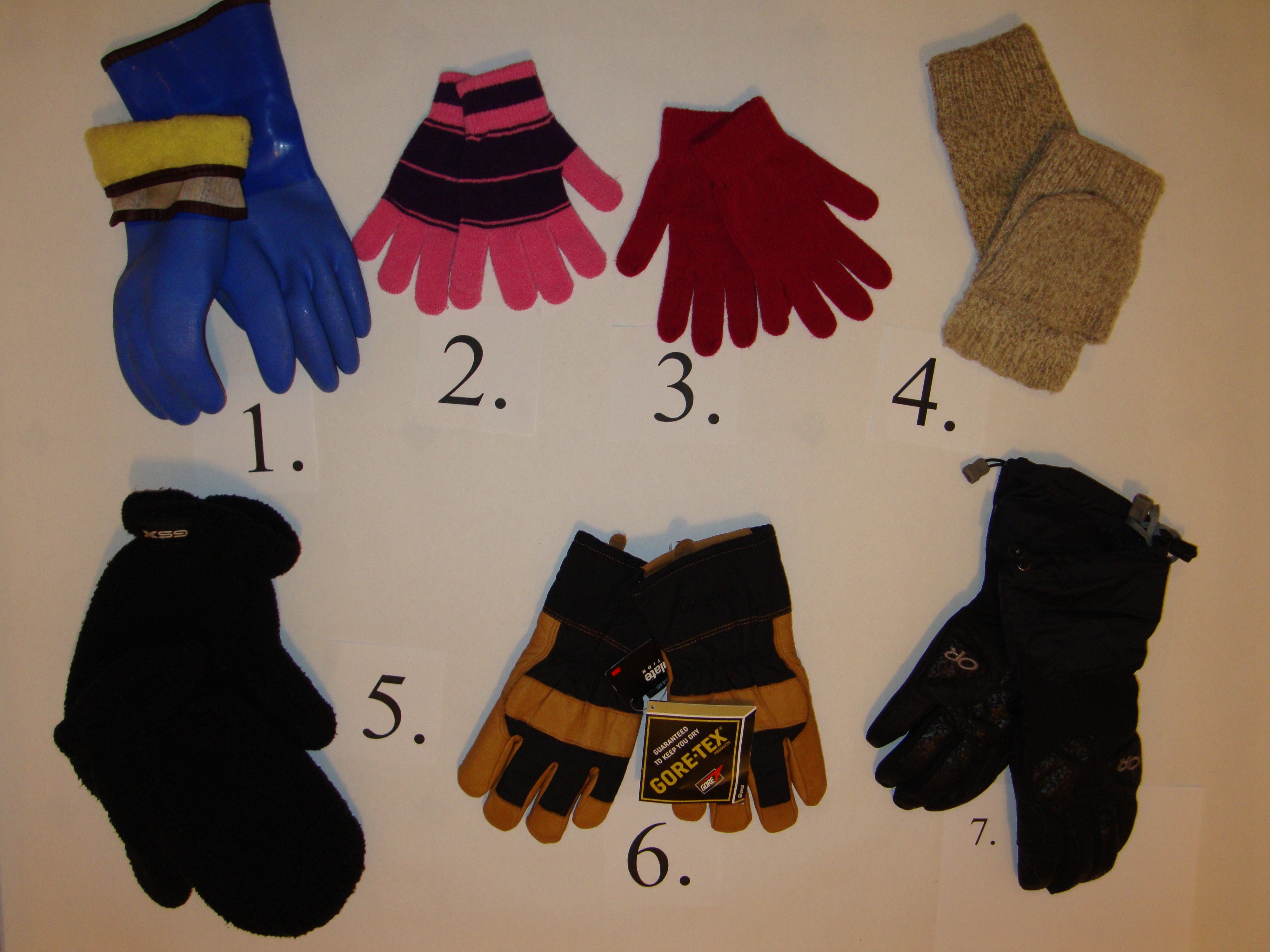 A layout of all of the gloves Chantelle Rose is taking on her expedition. At Brian Kalb's house in St. Paris, Ohio.