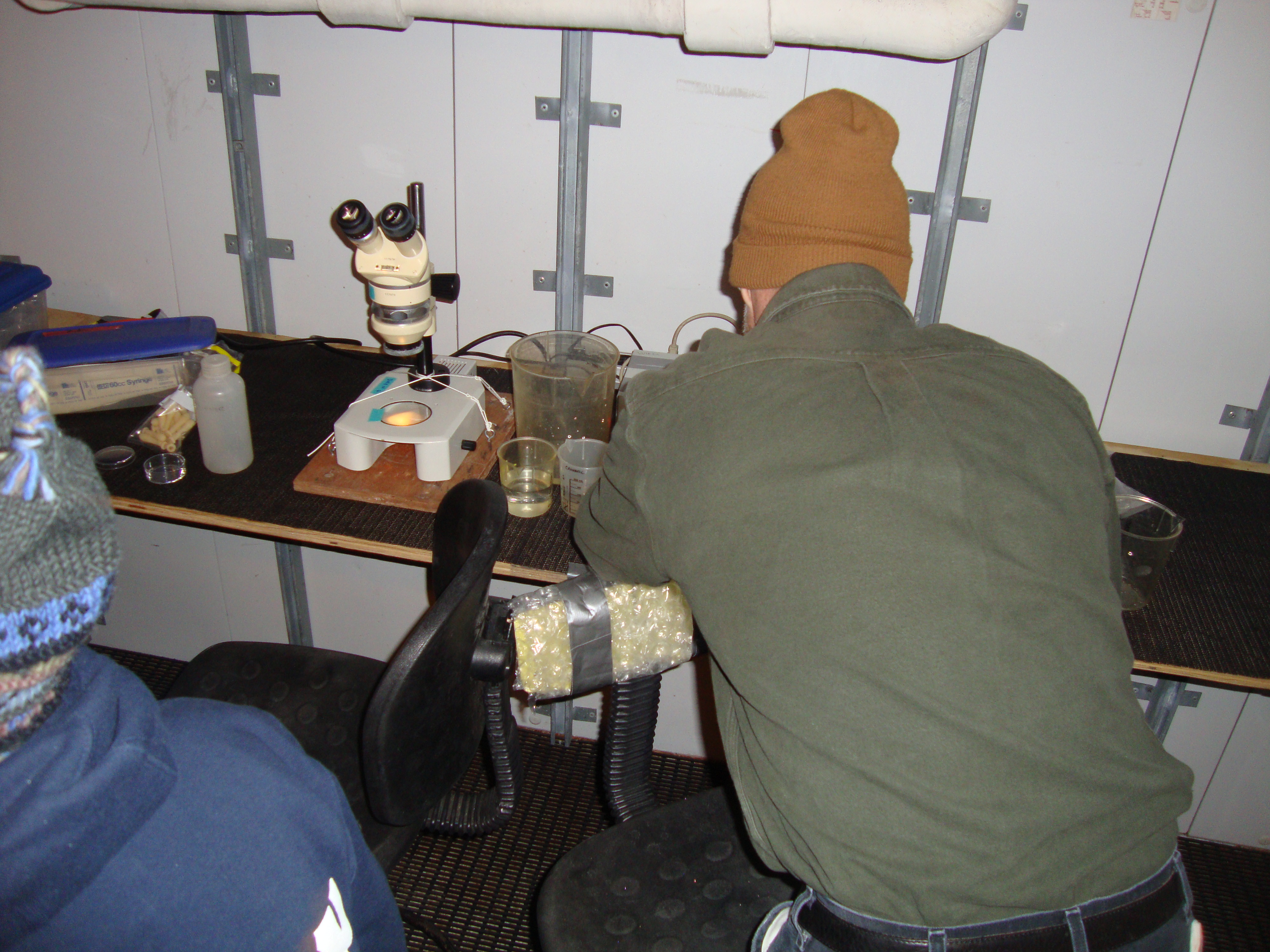 Bob and the microscope in the cold room. Aboard the USCGC Healy icebreaker.