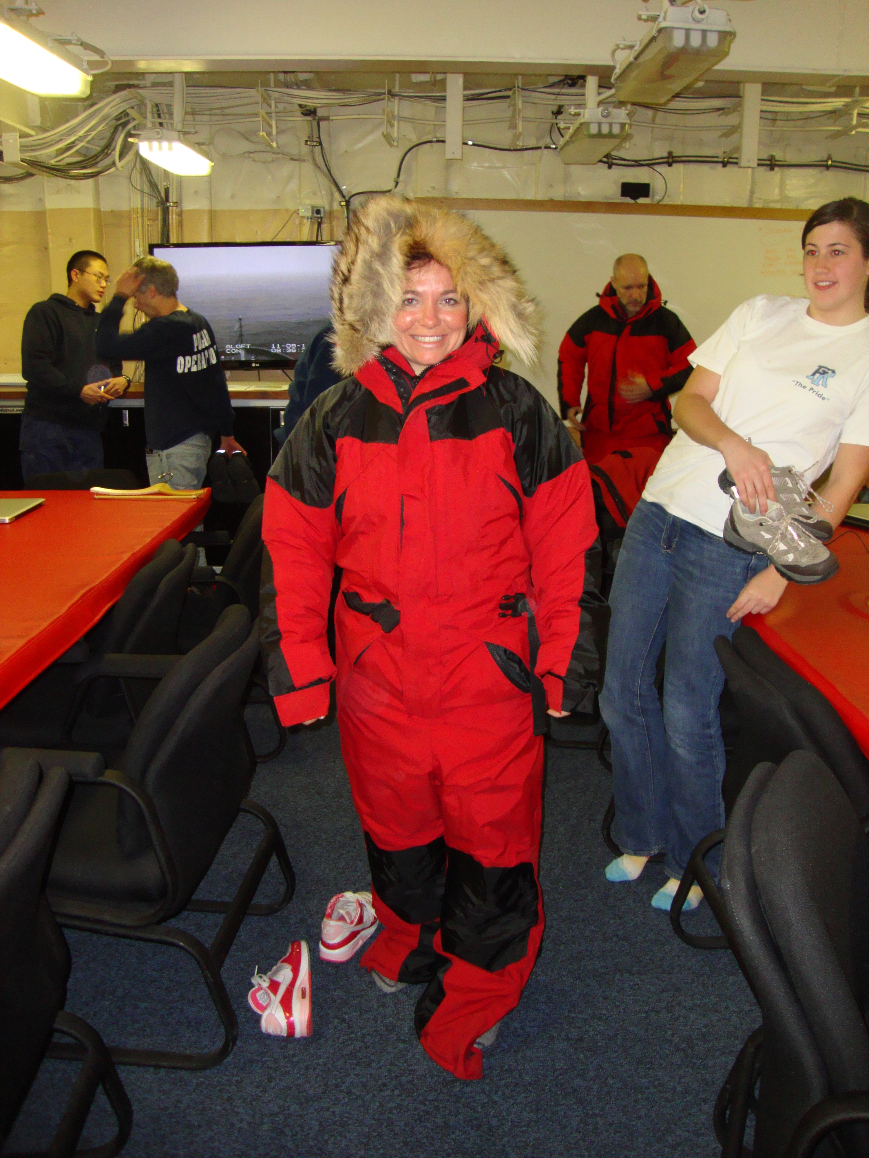 Chantelle Rose poses in a red snowsuit. Aboard the USCGC Healy icebreaker in the science conference lounge.