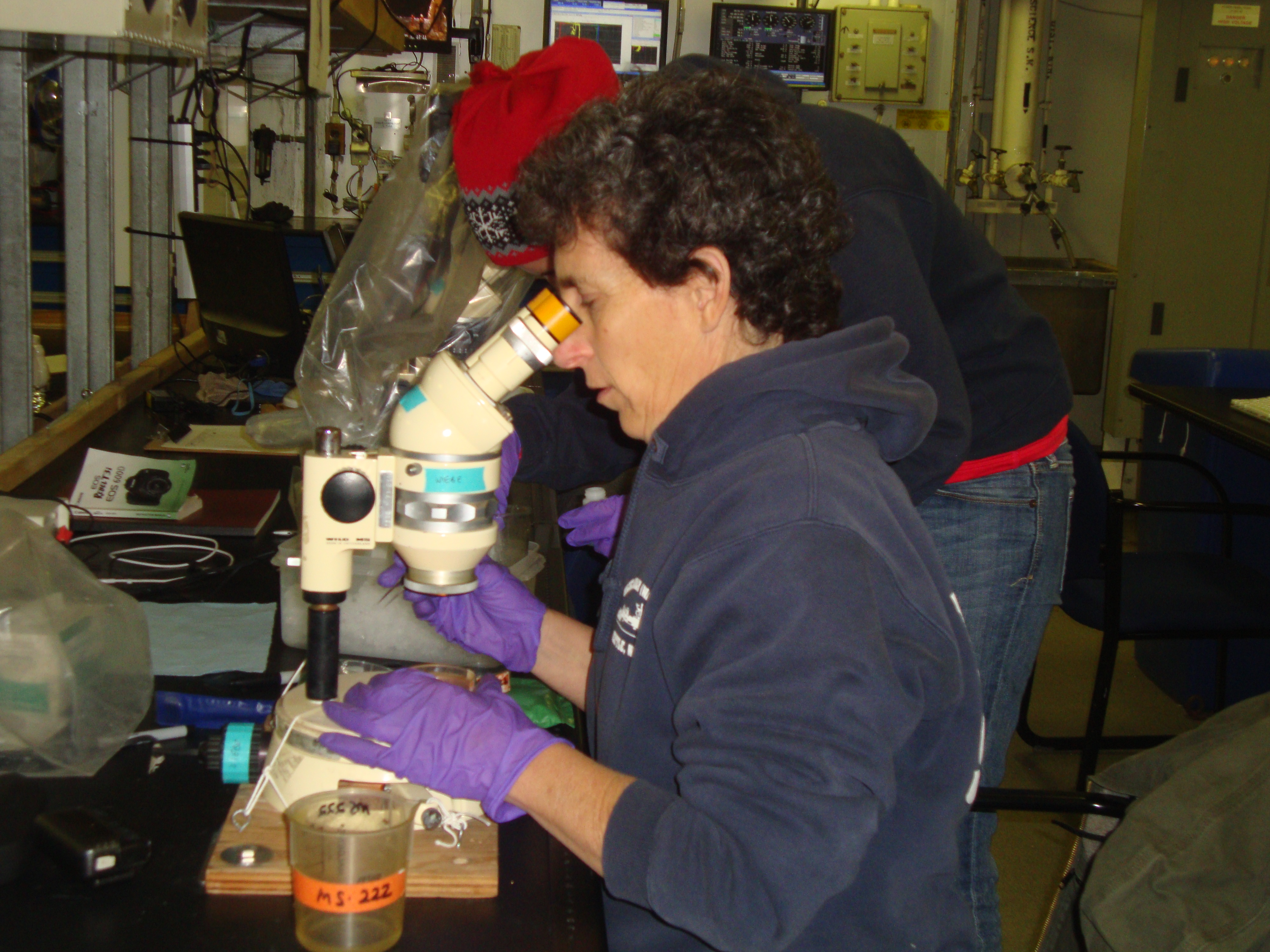 Celia picking copepods. Aboard the USCGC Healy icebreaker in the main lab.