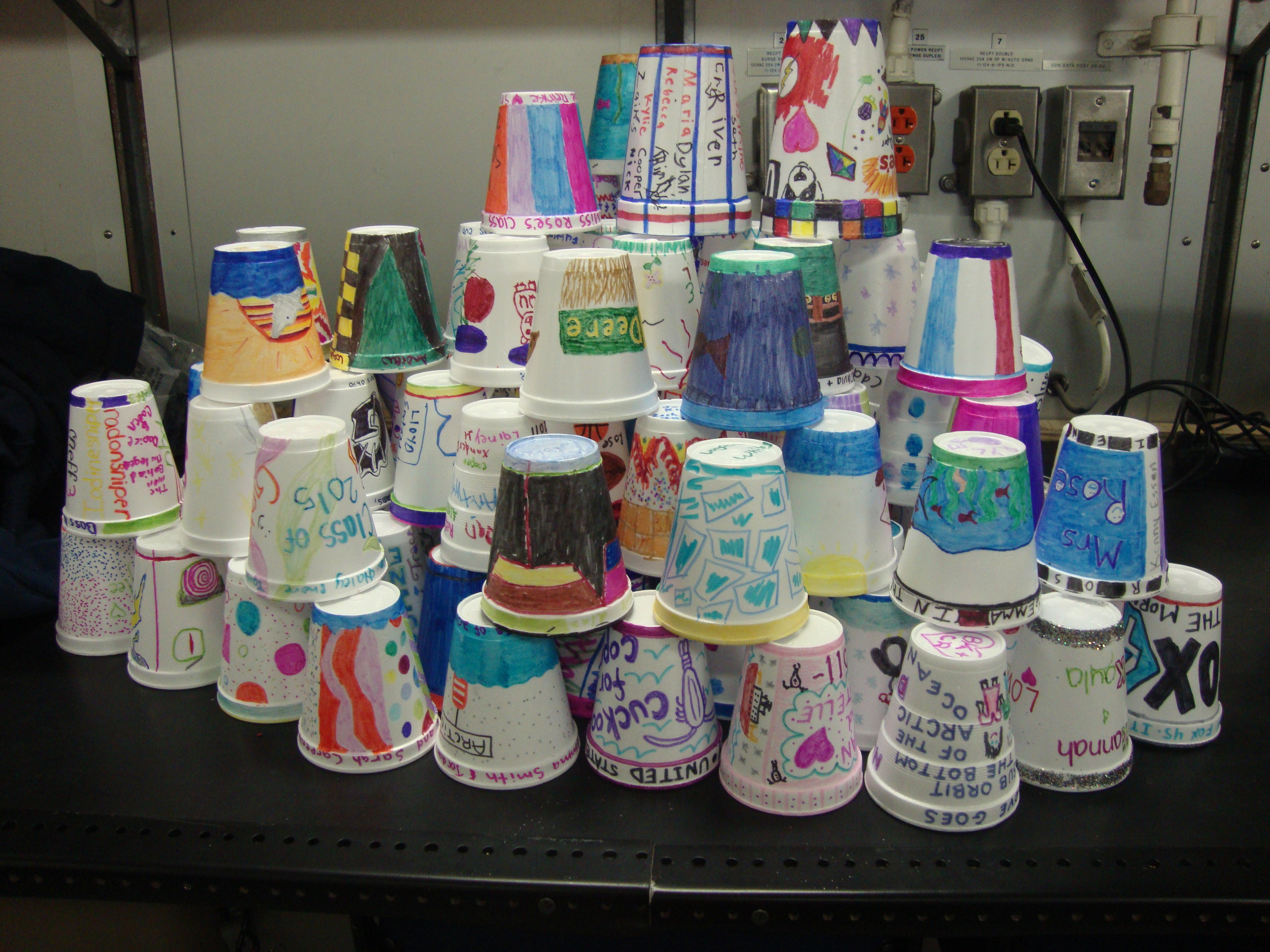These styrofoam cups will be submerged in the Arctic Ocean. Aboard the USCGC Healy icebreaker in the main lab.