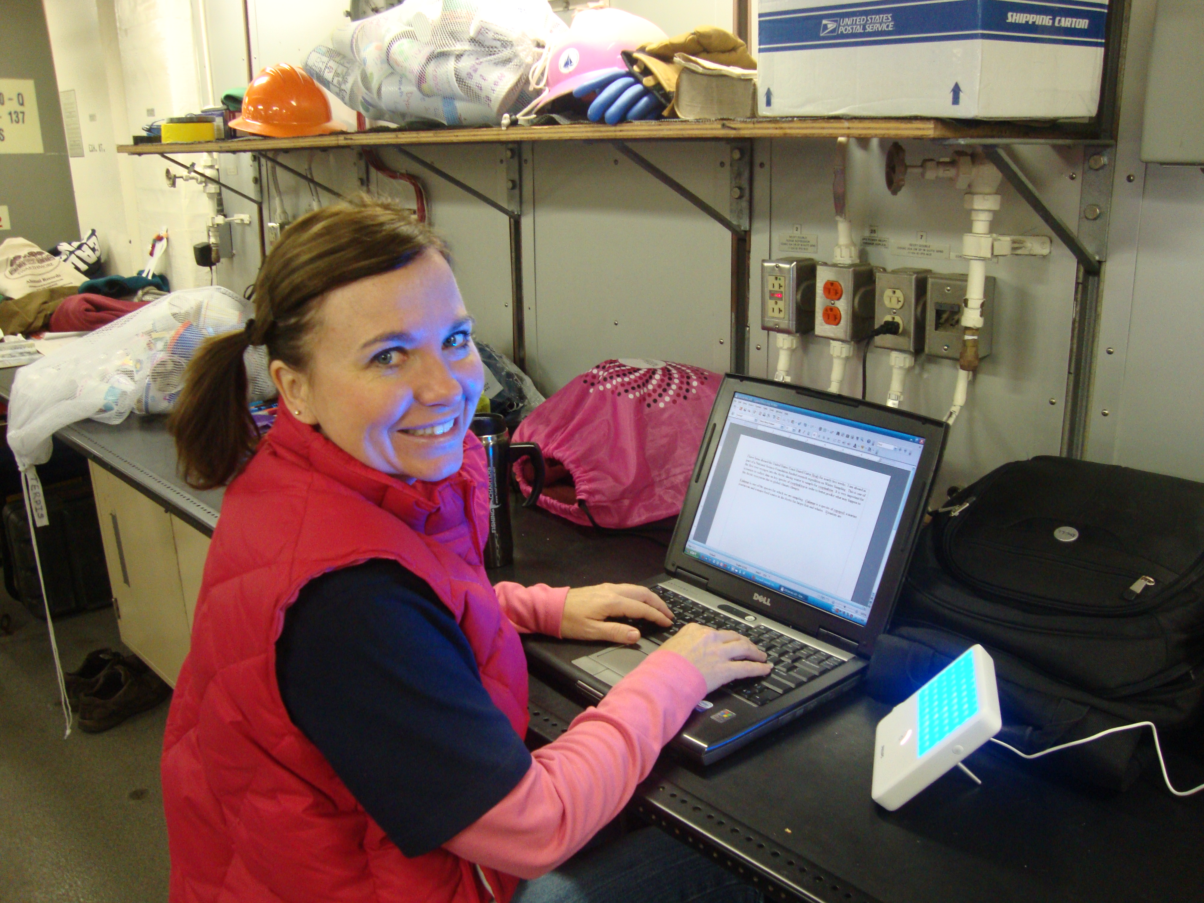Chantelle Rose with a blue therapy light. Aboard the USCGC Healy icebreaker in the main lab.