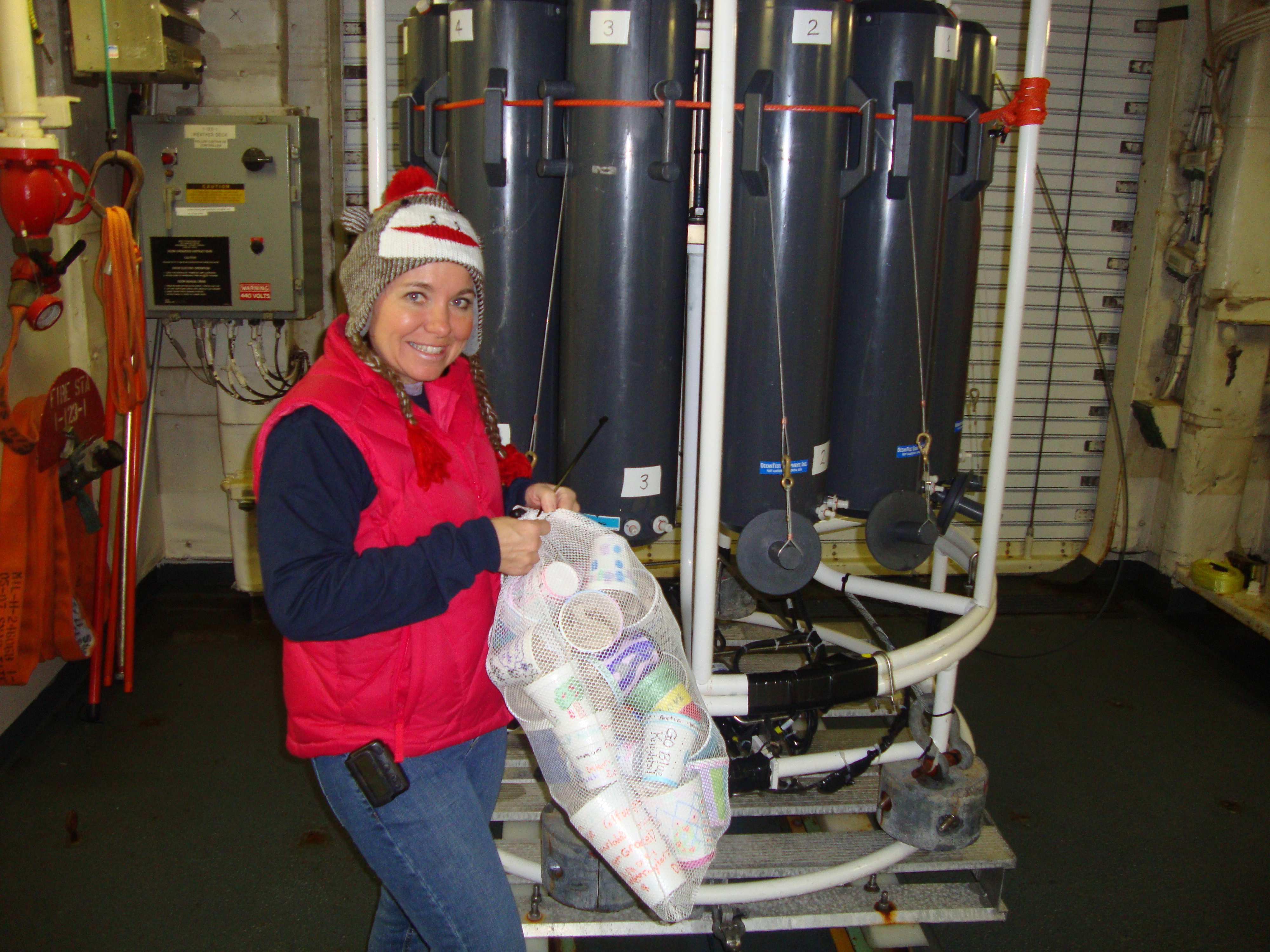 The bags of styrofoam cups are ziptied to the CTD (Conductivity, Temperature, and Depth instrument) . Aboard the USCGC Healy icebreaker in the CTD room.