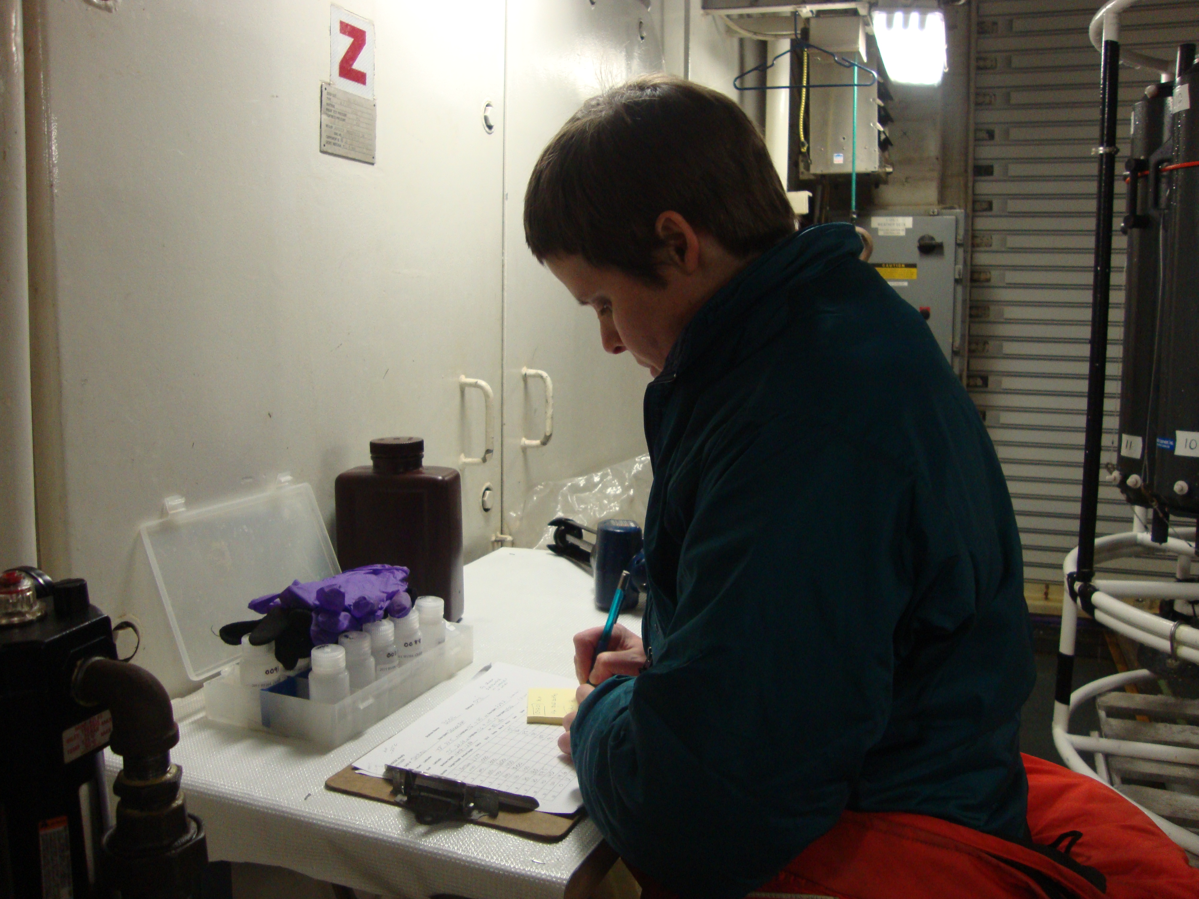 Krista sampling oxygen. Aboard the USCGC Healy icebreaker in the CTD room.