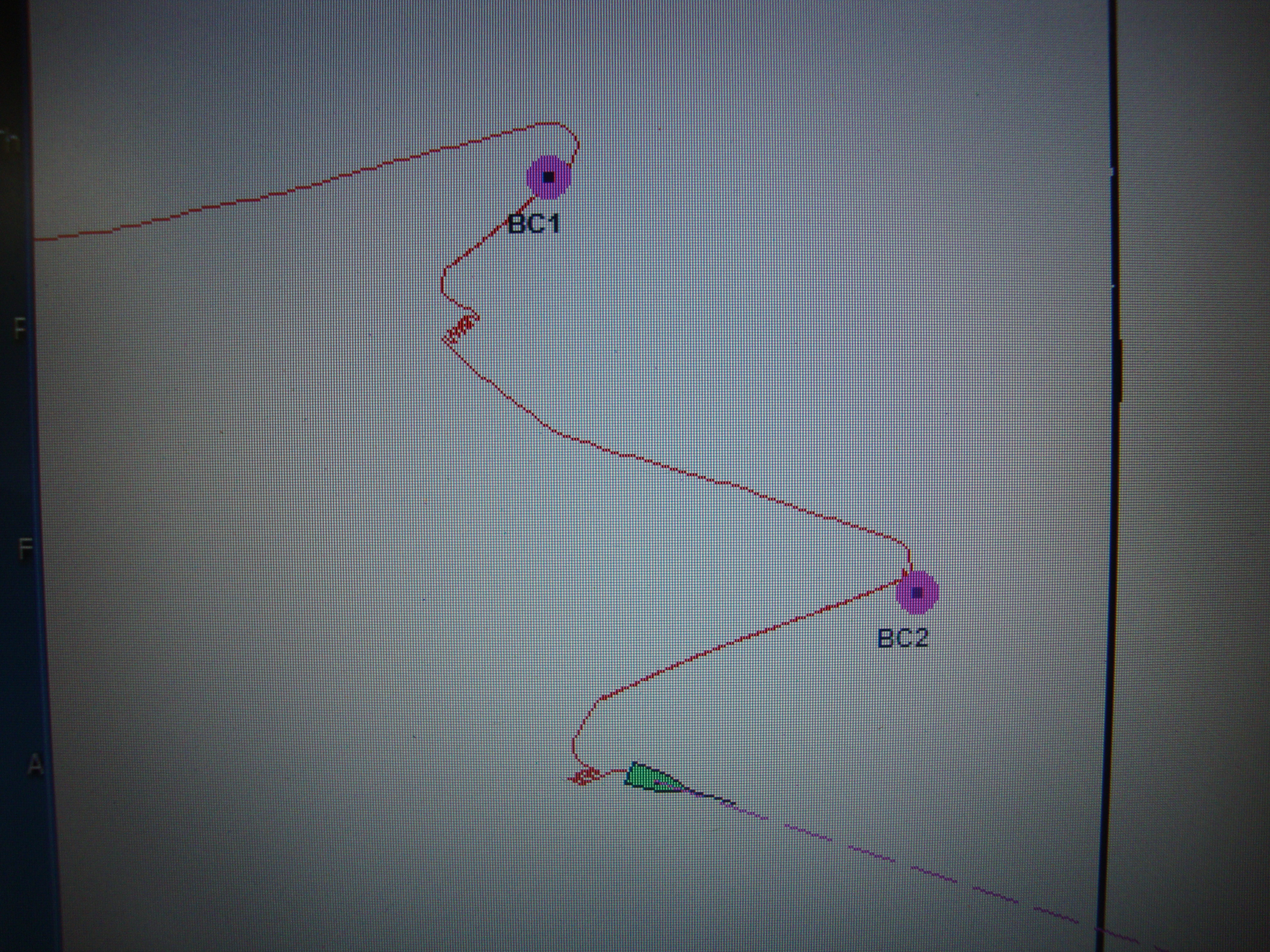 The path of Healy showing a couple instances of the back-and-ram method of breaking sea ice. Aboard the USCGC Healy icebreaker in the main lab.
